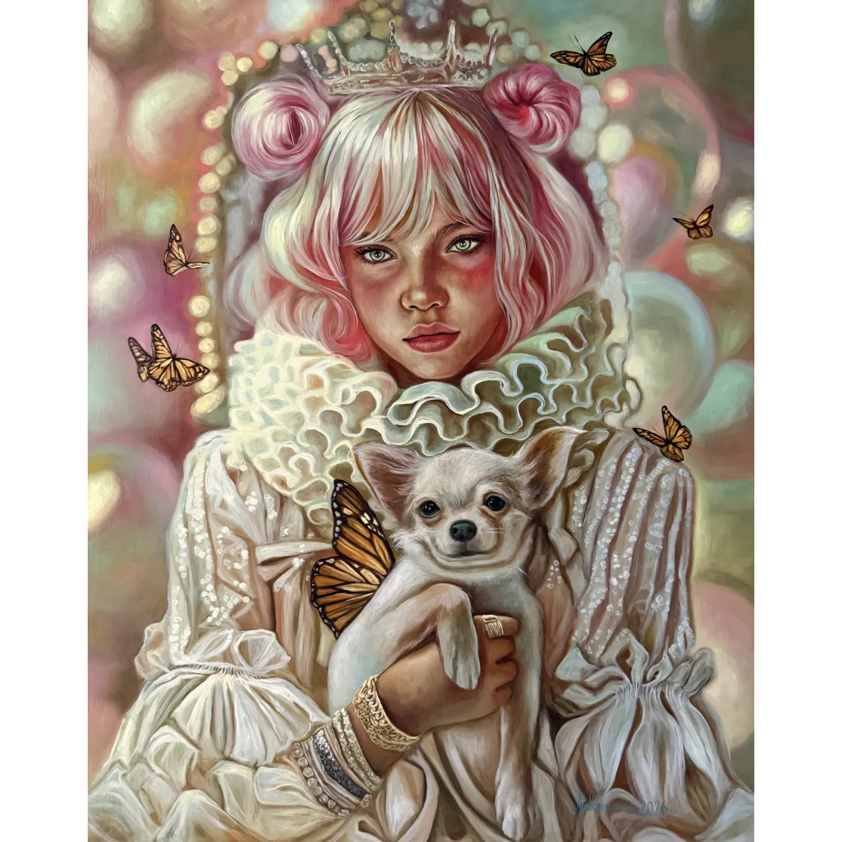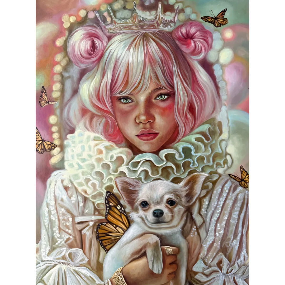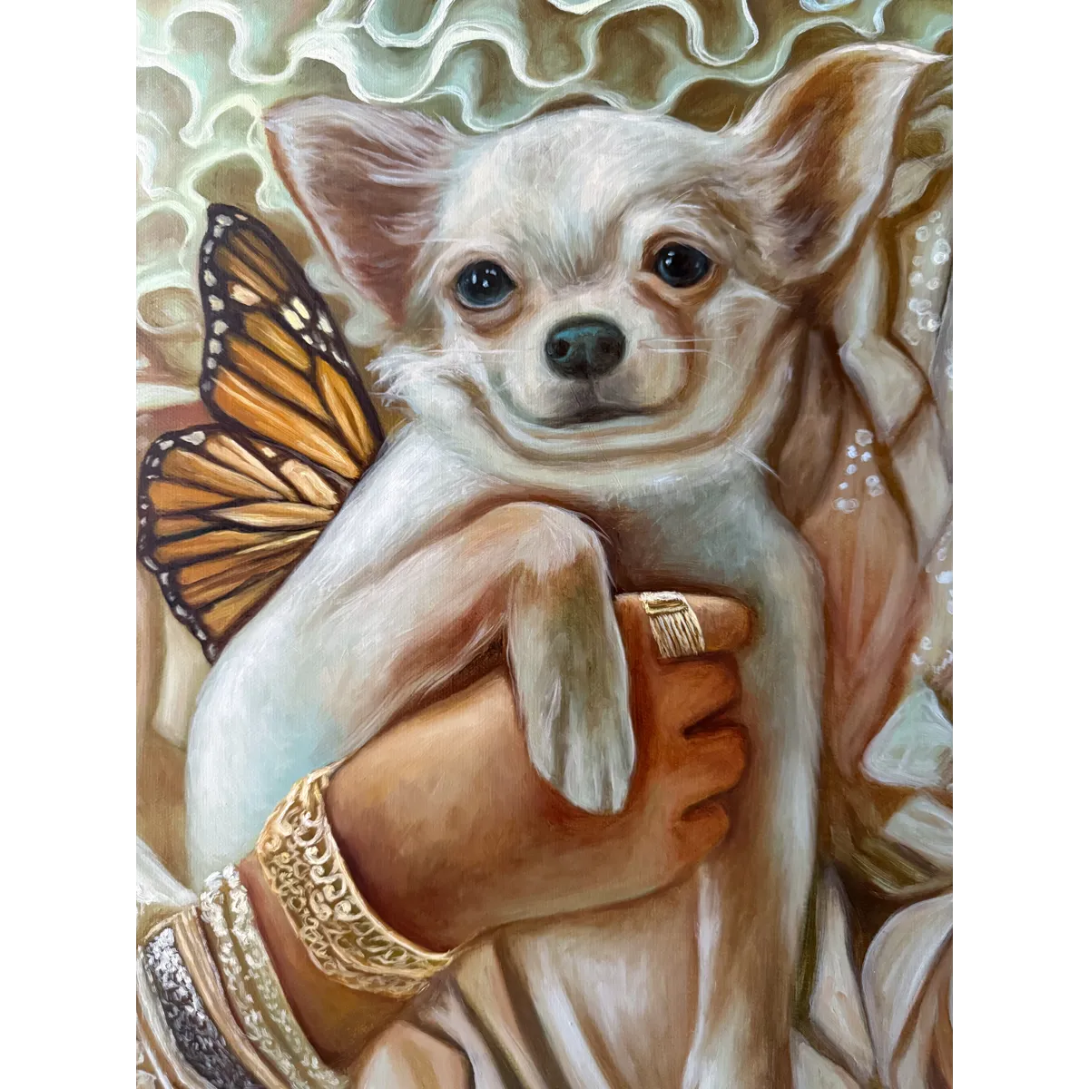 "The idea came to me one day as I watched my sister with her butterflies. She has a mariposario where she lovingly breeds them, and she also has the cutest little chihuahua. To me, my sister is a queen. A strong one. That is why this painting portrays a queen seated on her throne, wearing a ruffled gown, surrounded by her butterflies, with her loyal chihuahua by her side “Monarca” is my tribute to her strength, her independence, and the powerful spirit I see in her every day."