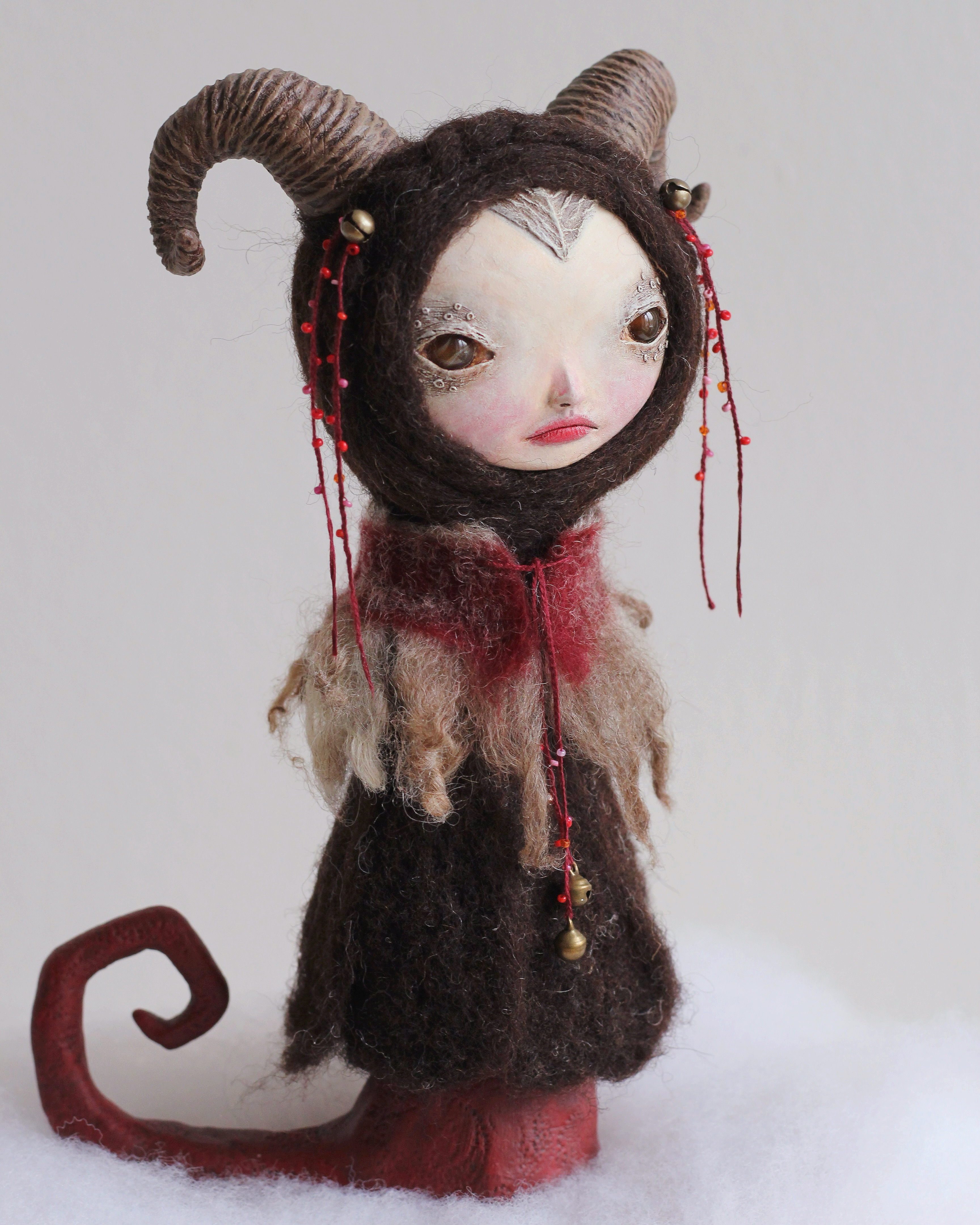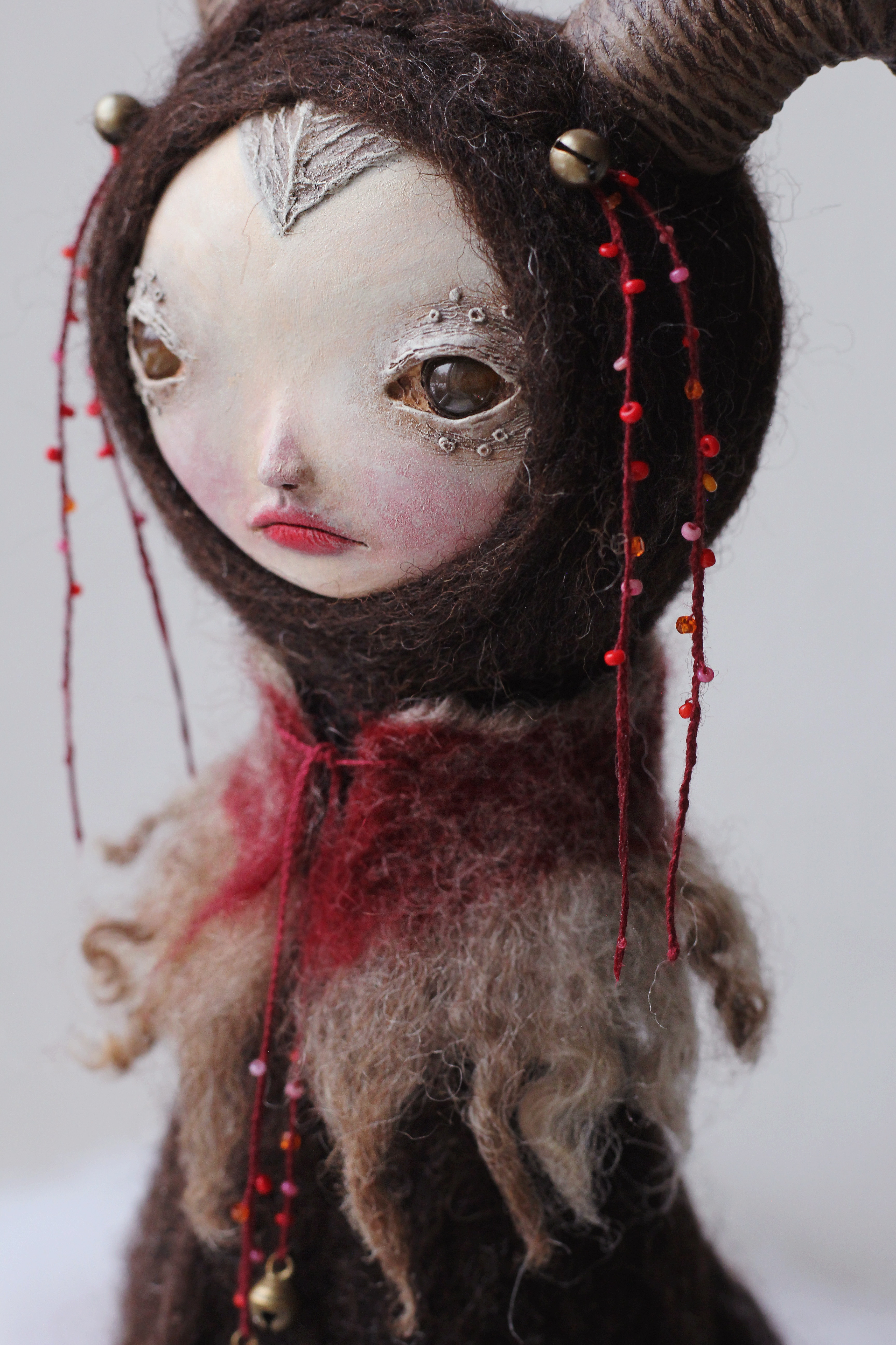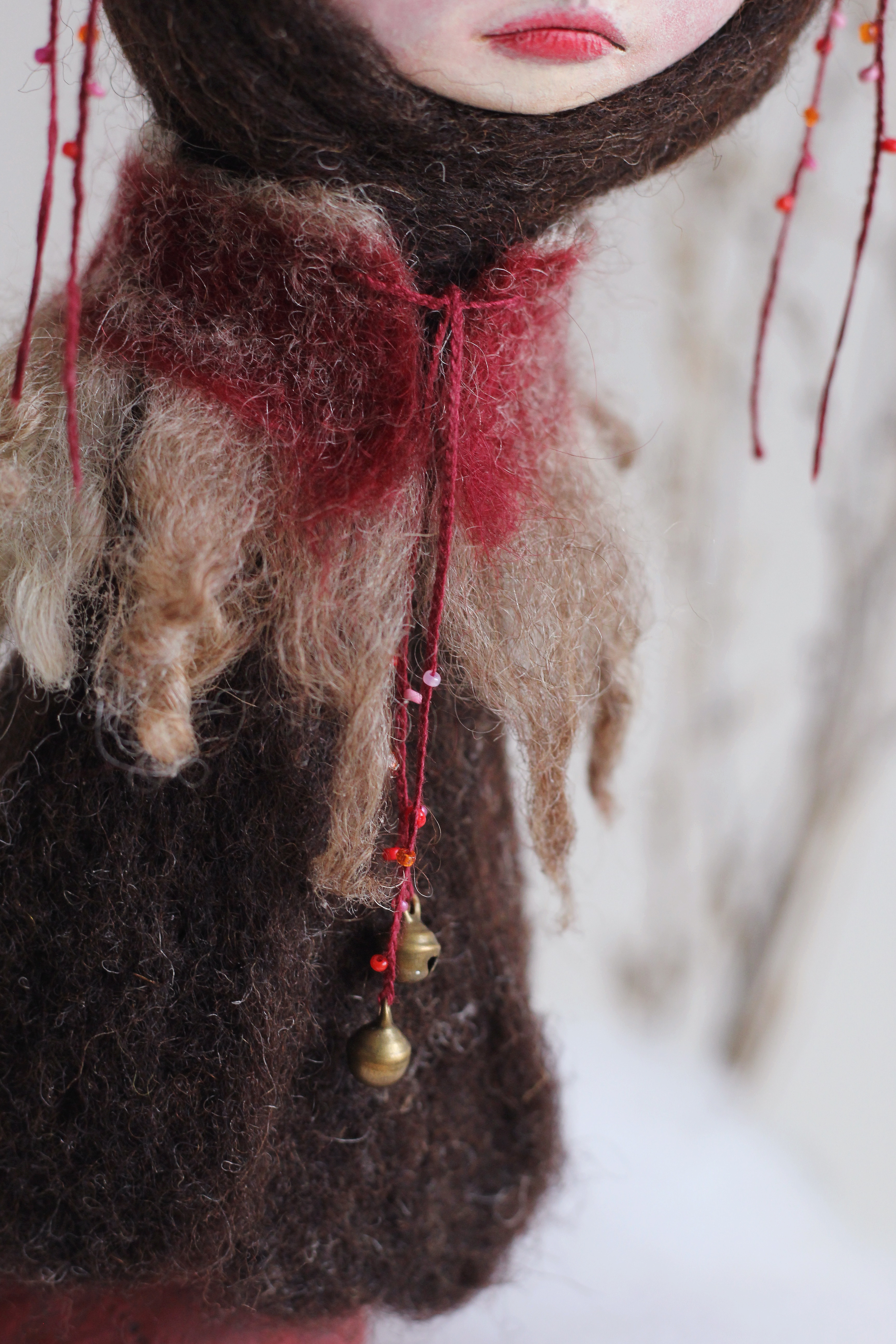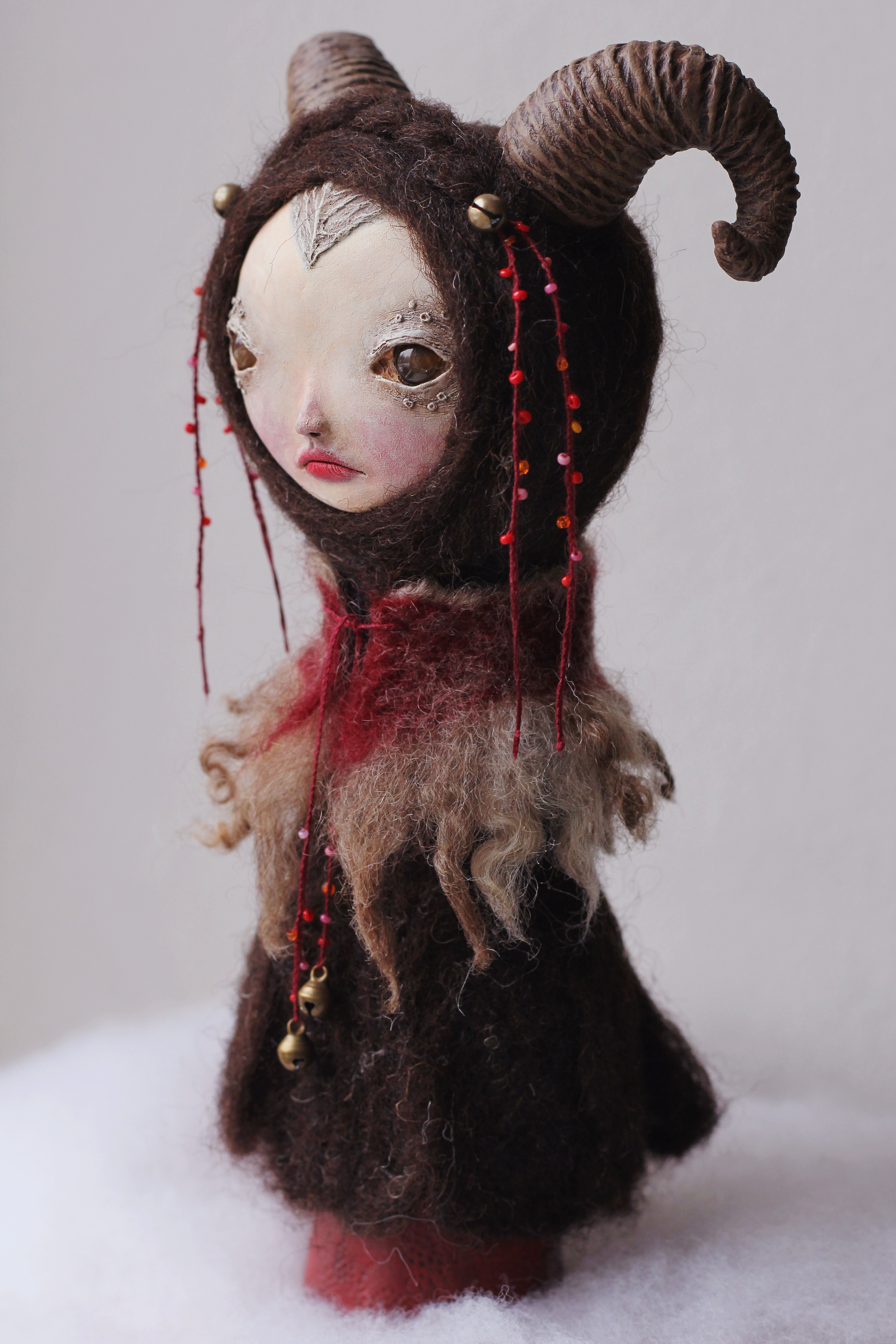 Materials: paper clay, epoxy clay, sheep wool, acrylics, varnish, yarn, beads, bells