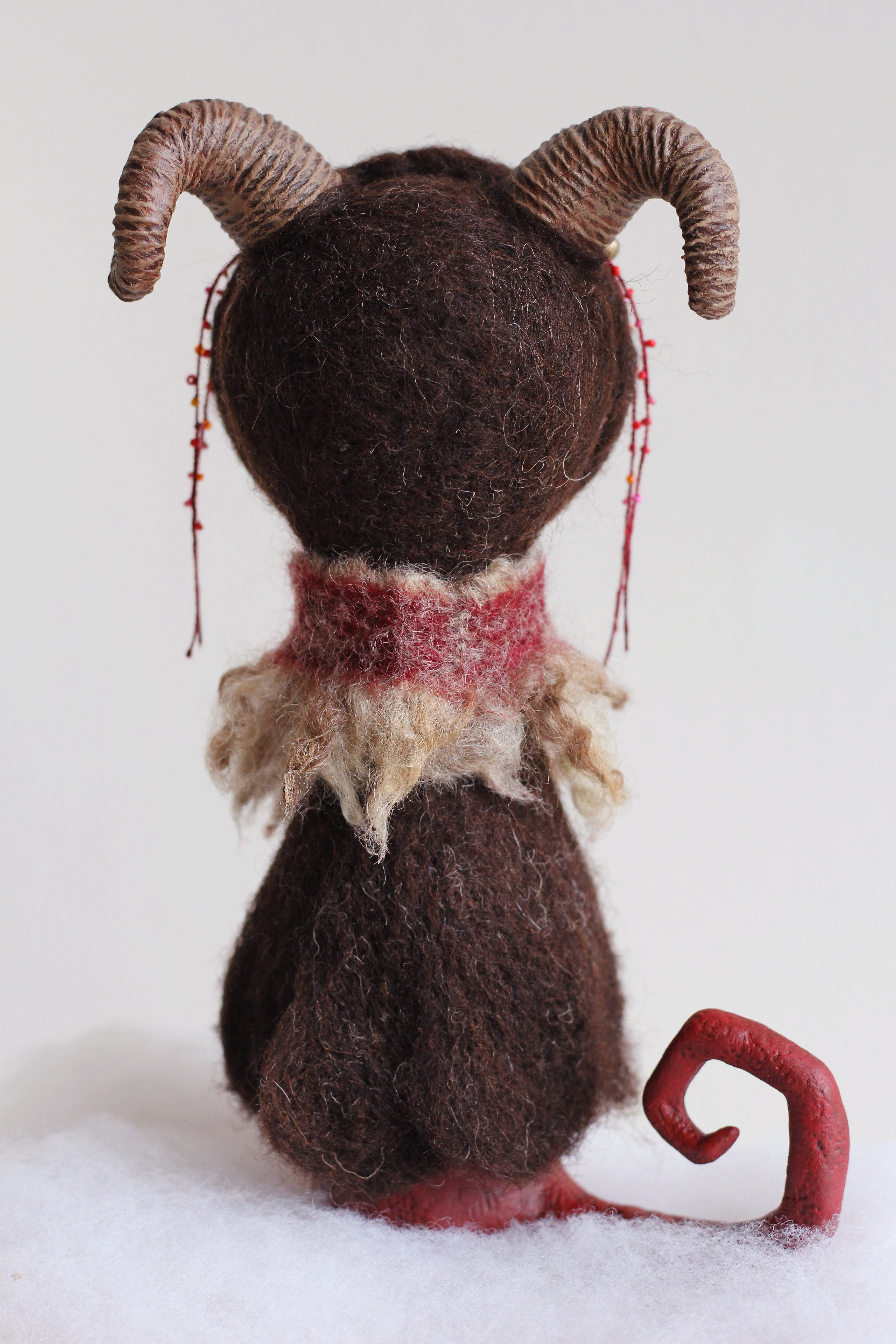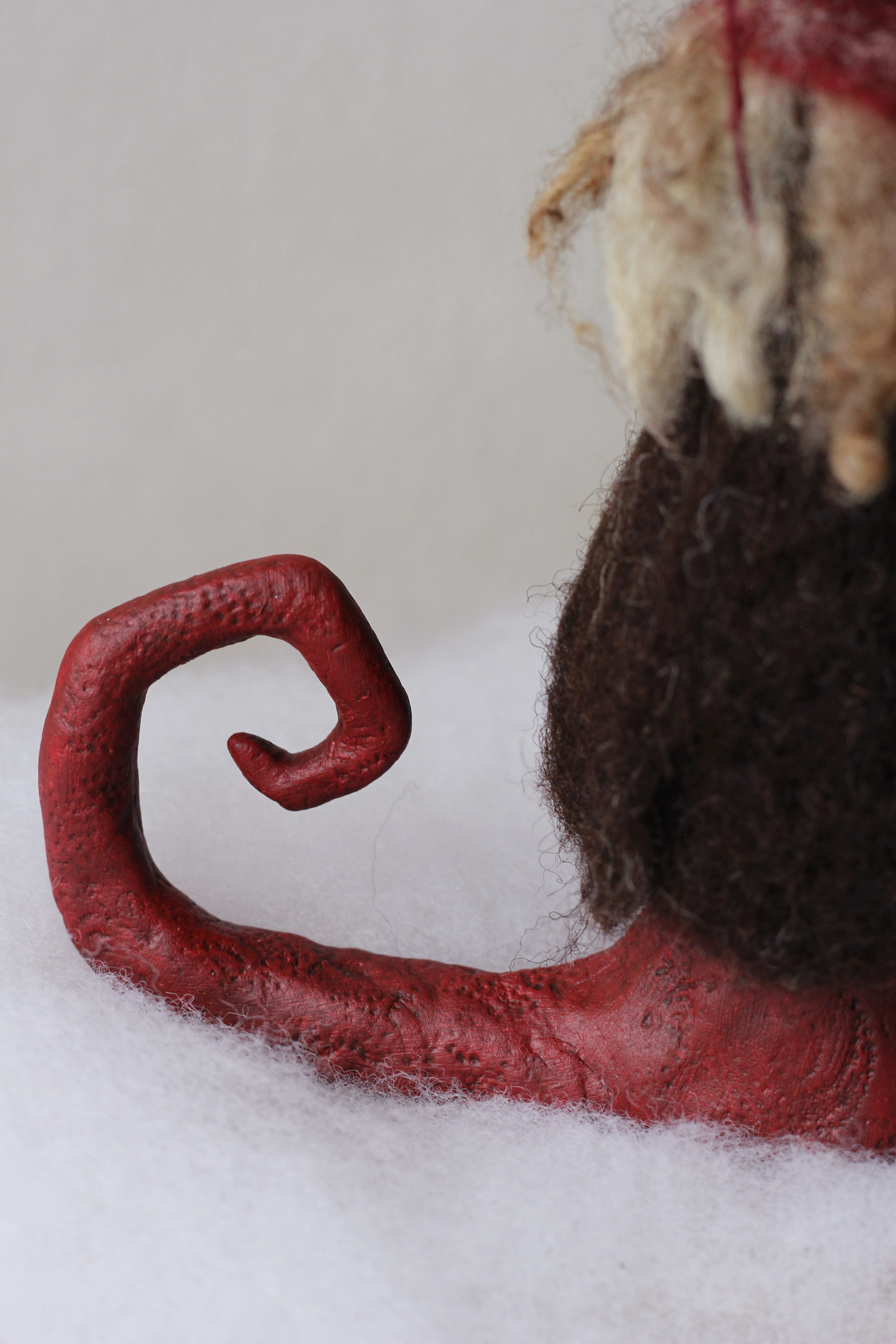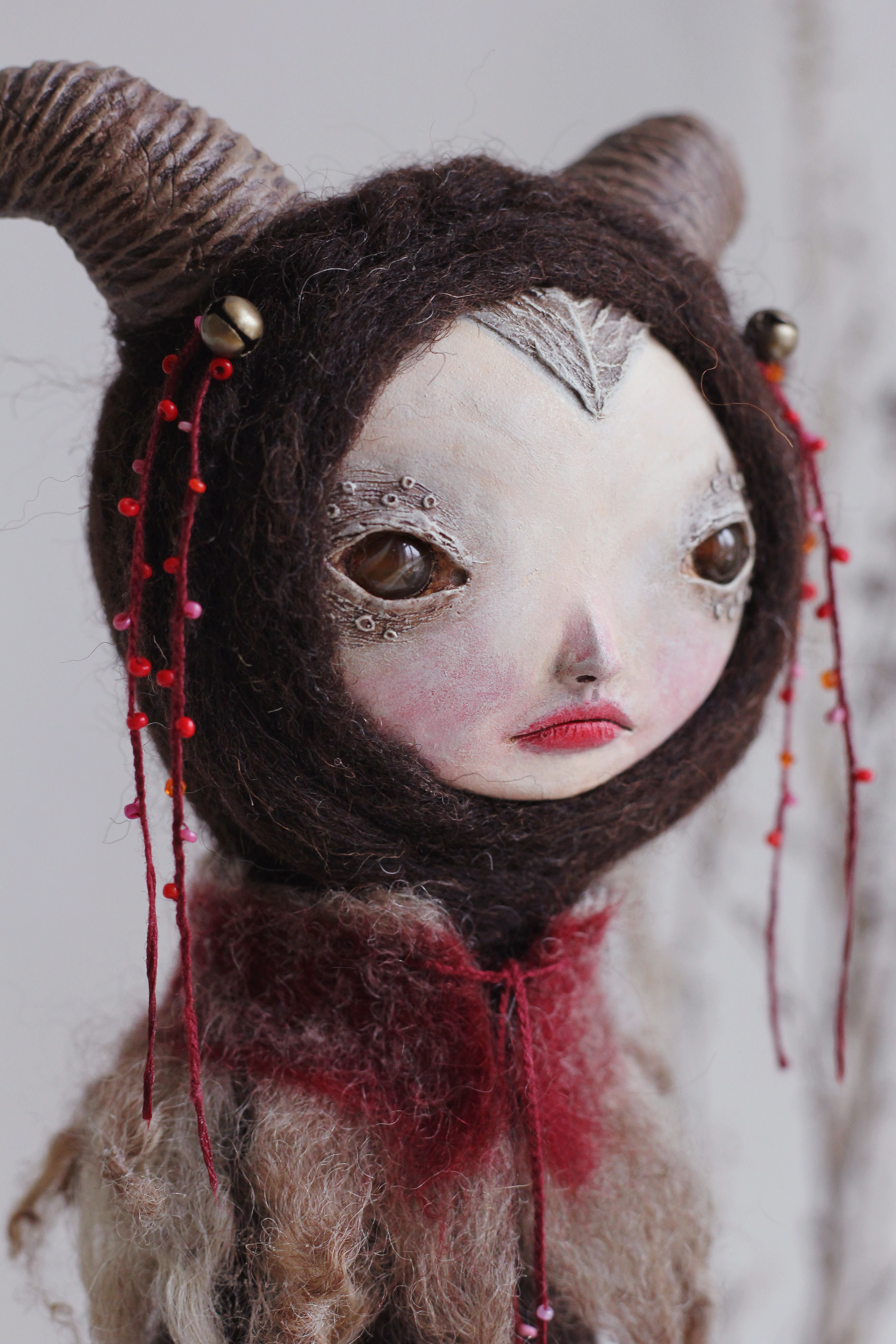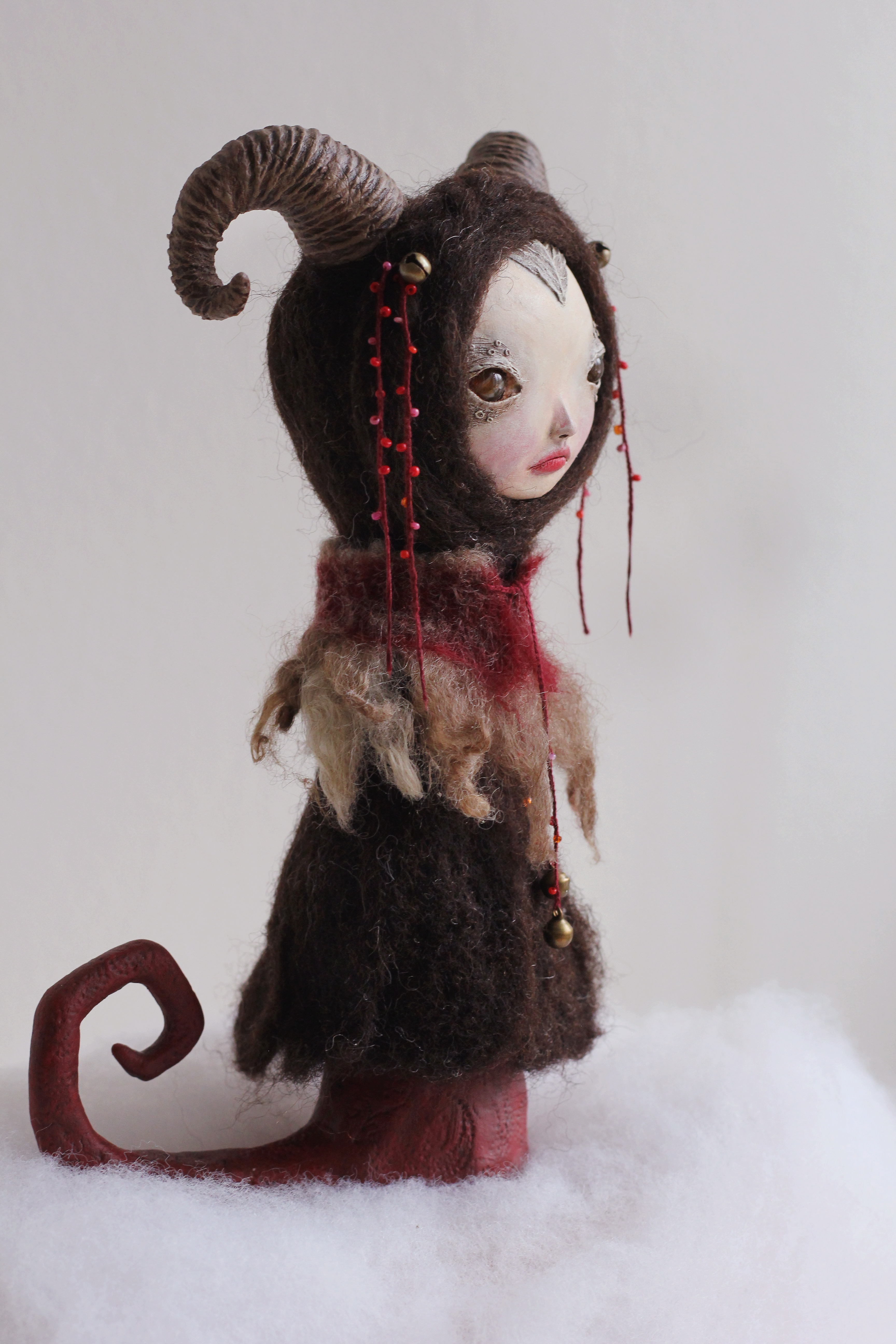 Materials: paper clay, epoxy clay, sheep wool, acrylics, varnish, yarn, beads, bells