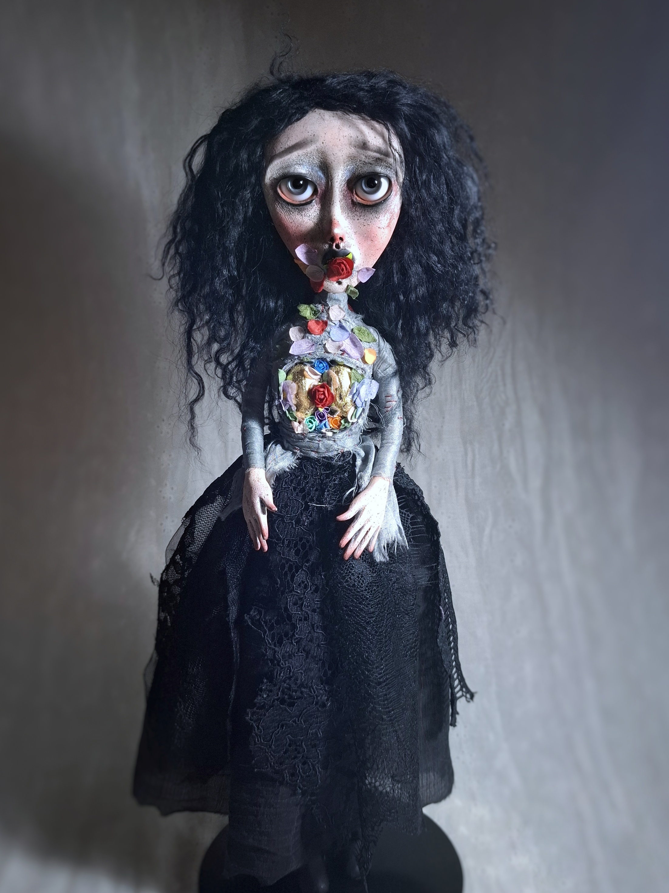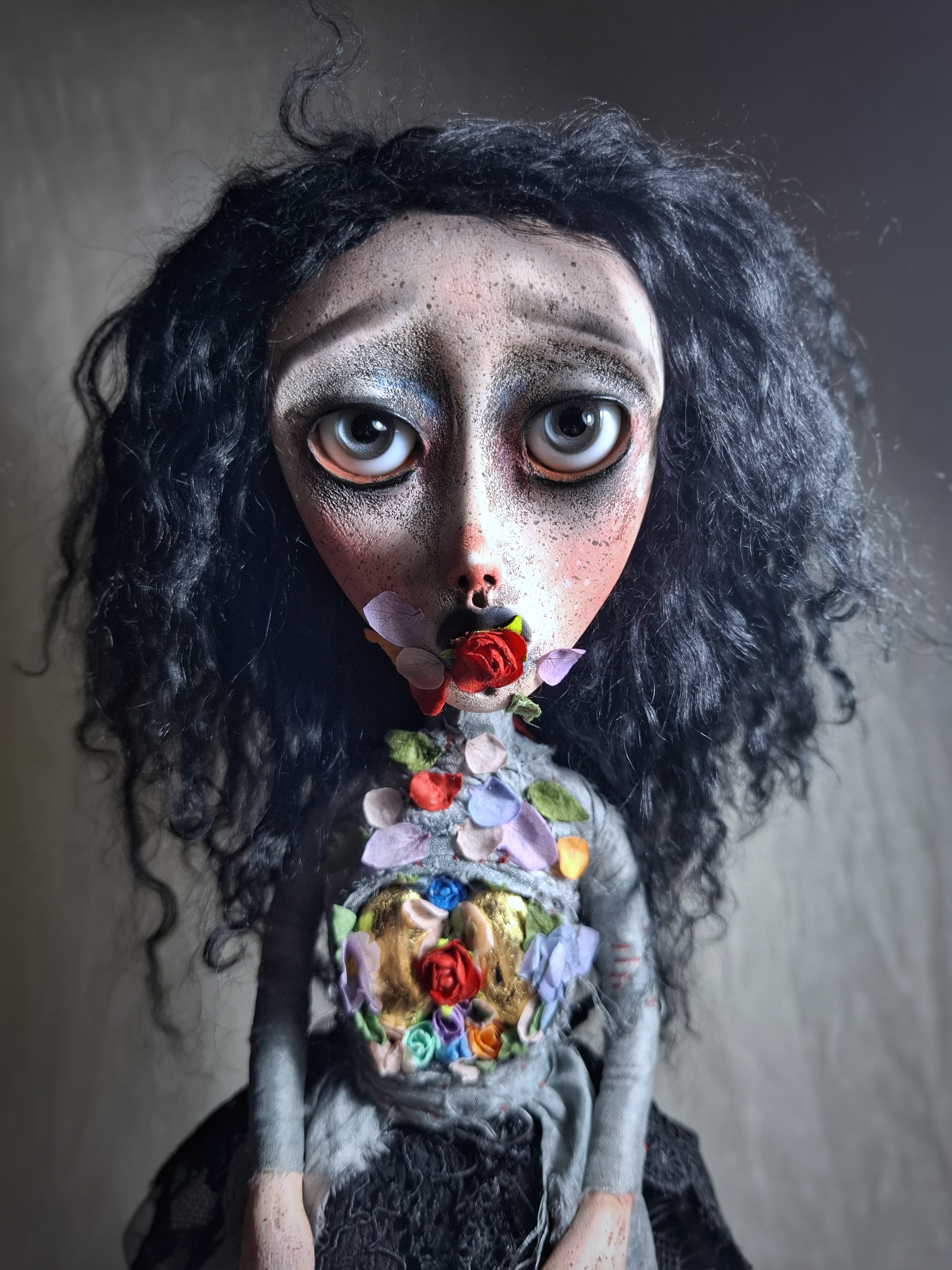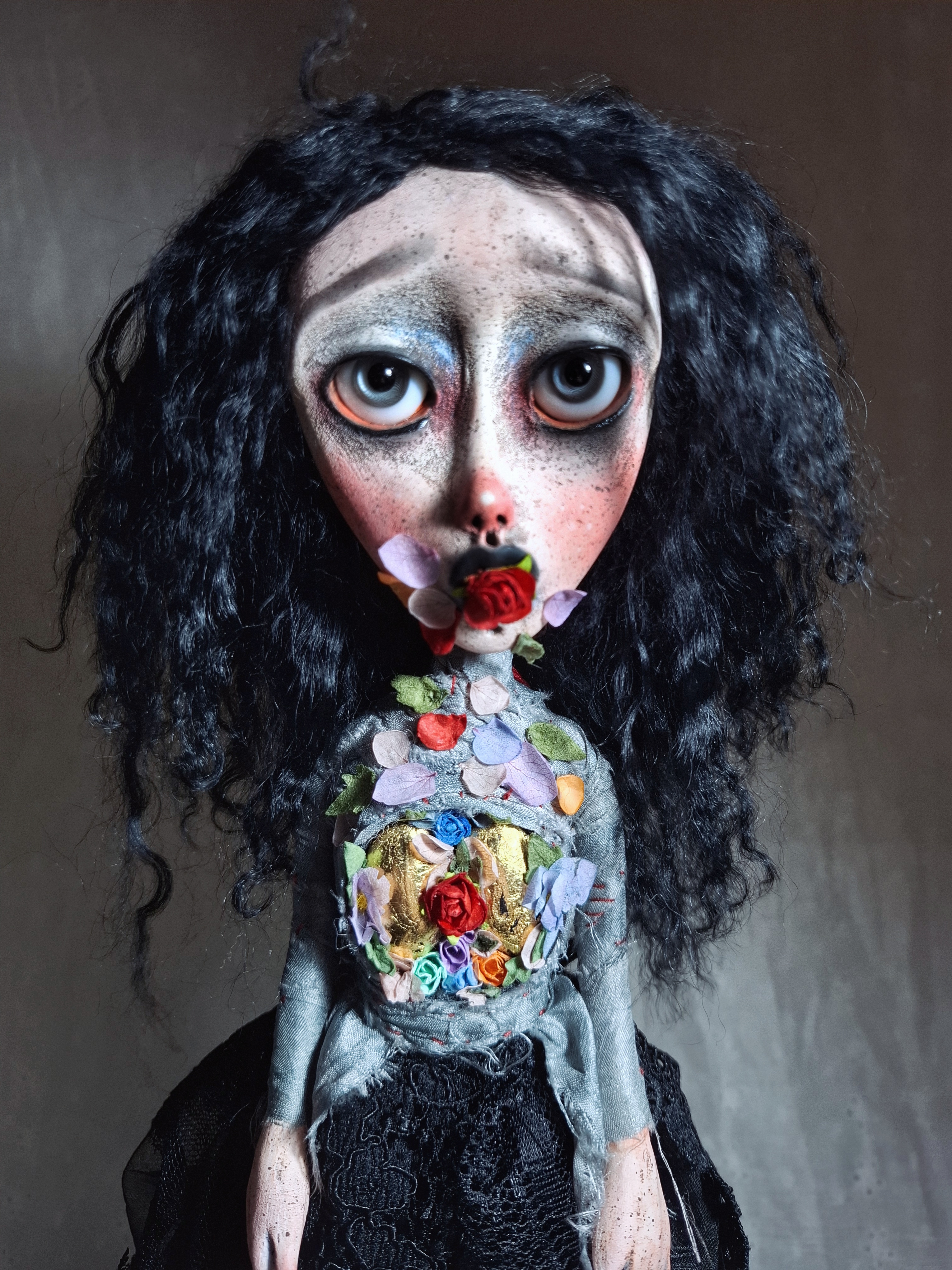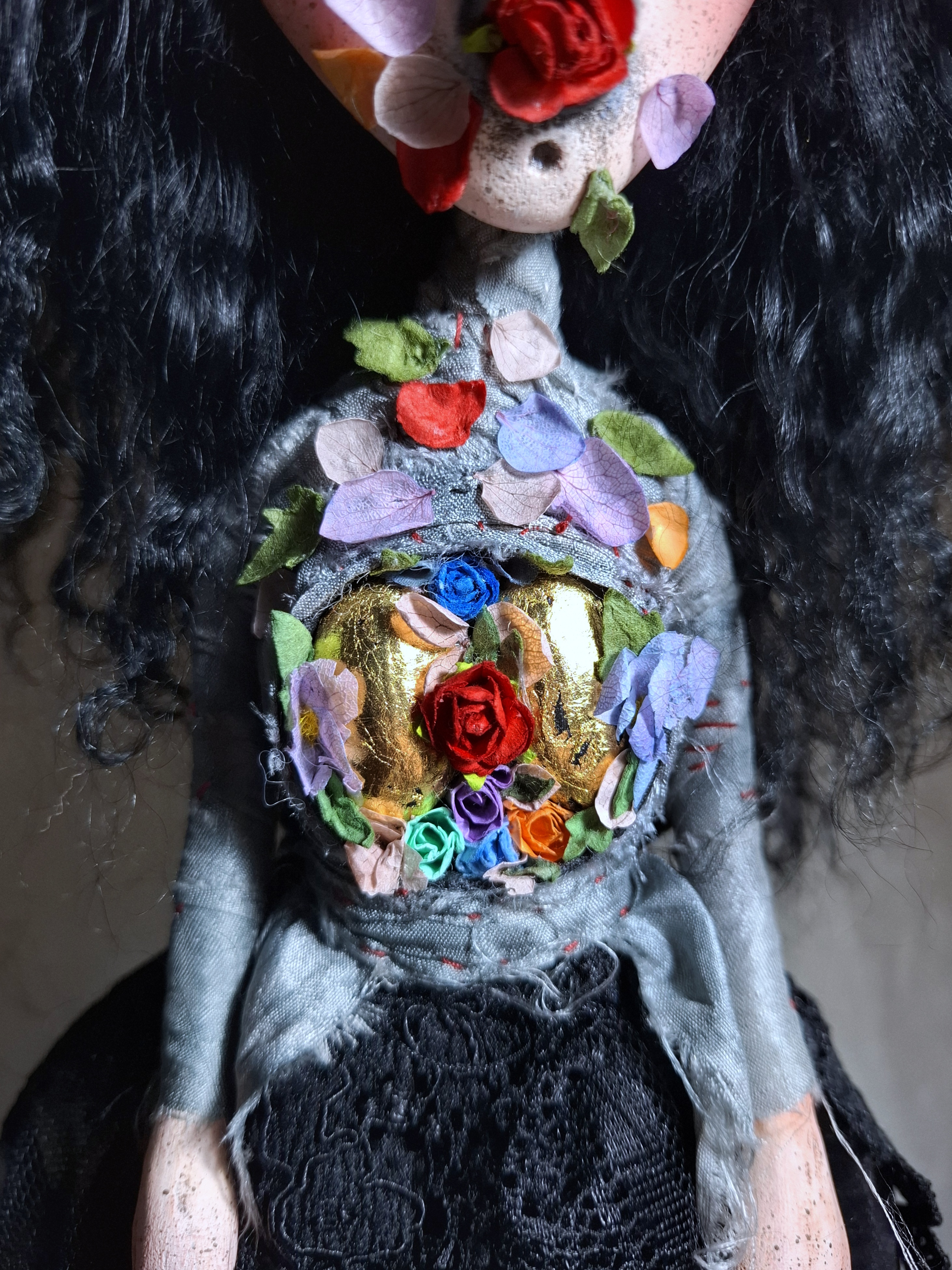 Mixed media: paperclay, polymer clay, dried flowers, paper flowers, variety of textiles, such as silk, lace, felt, trims and silk threads. She is painted with acrylics, soft pastels and colored pencils, and sealed with matte and gloss varnish. She can be displayed with a doll stand (not included), seated with some back support, or hang on the wall (loop included).