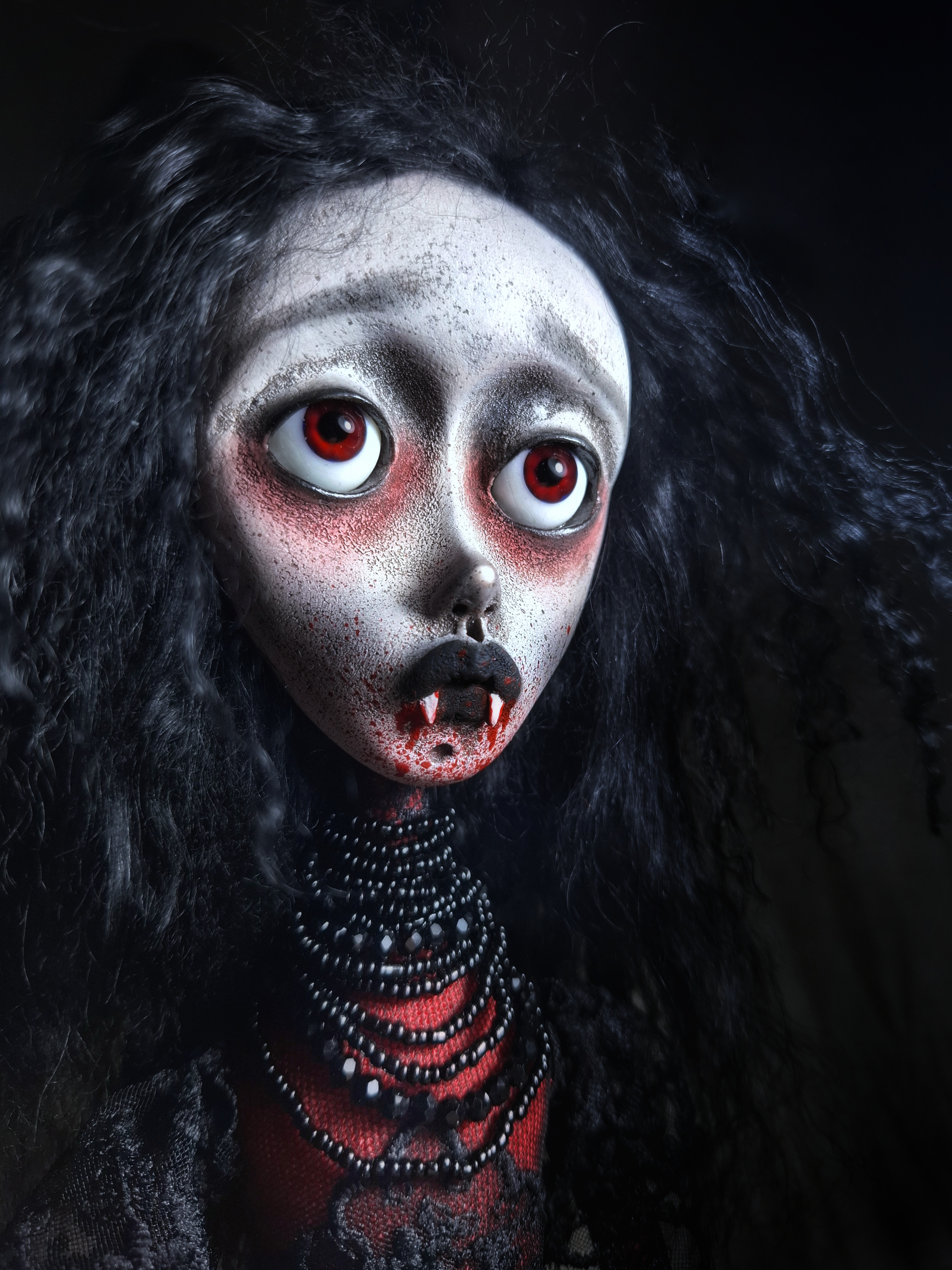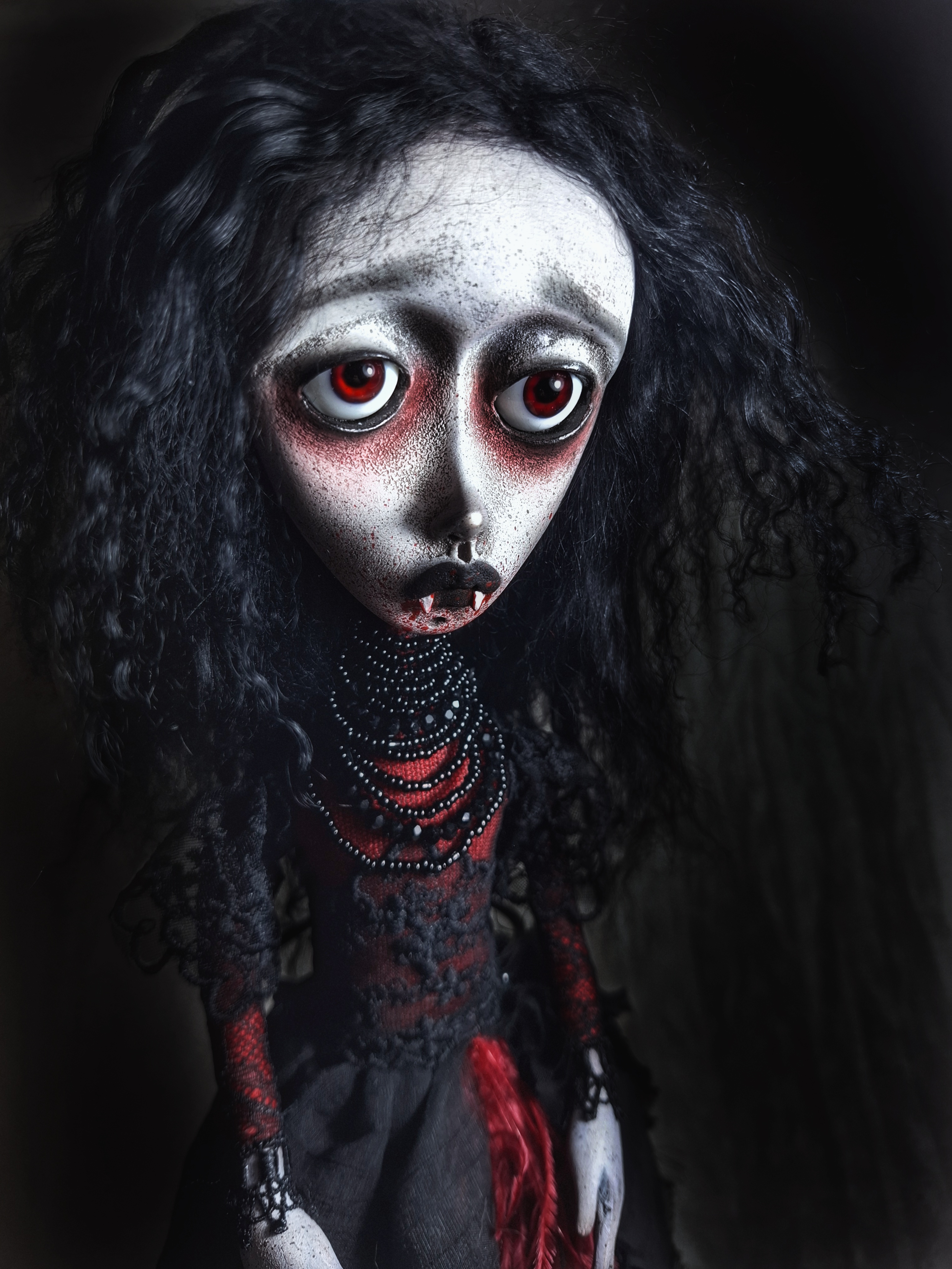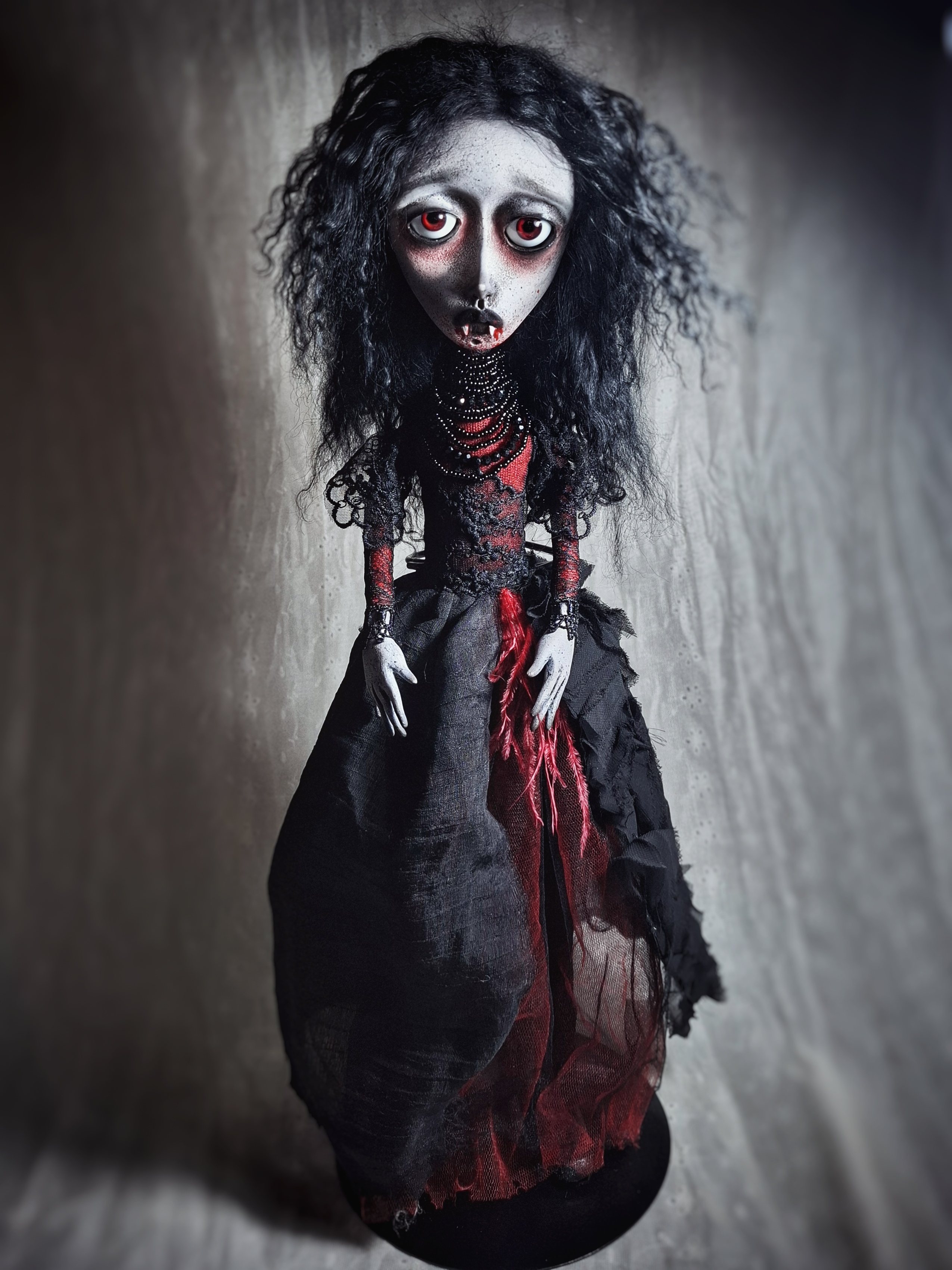 Mixed media: Paperclay, polymer clay, beads, feathers, variety of textiles, such as silk, lace, felt, trims and silk threads. She is painted with acrylics, soft pastels and colored pencils, and sealed with matte and gloss varnish. She can be displayed with a doll stand (not included), seated with some back support, or hang on the wall (loop included).