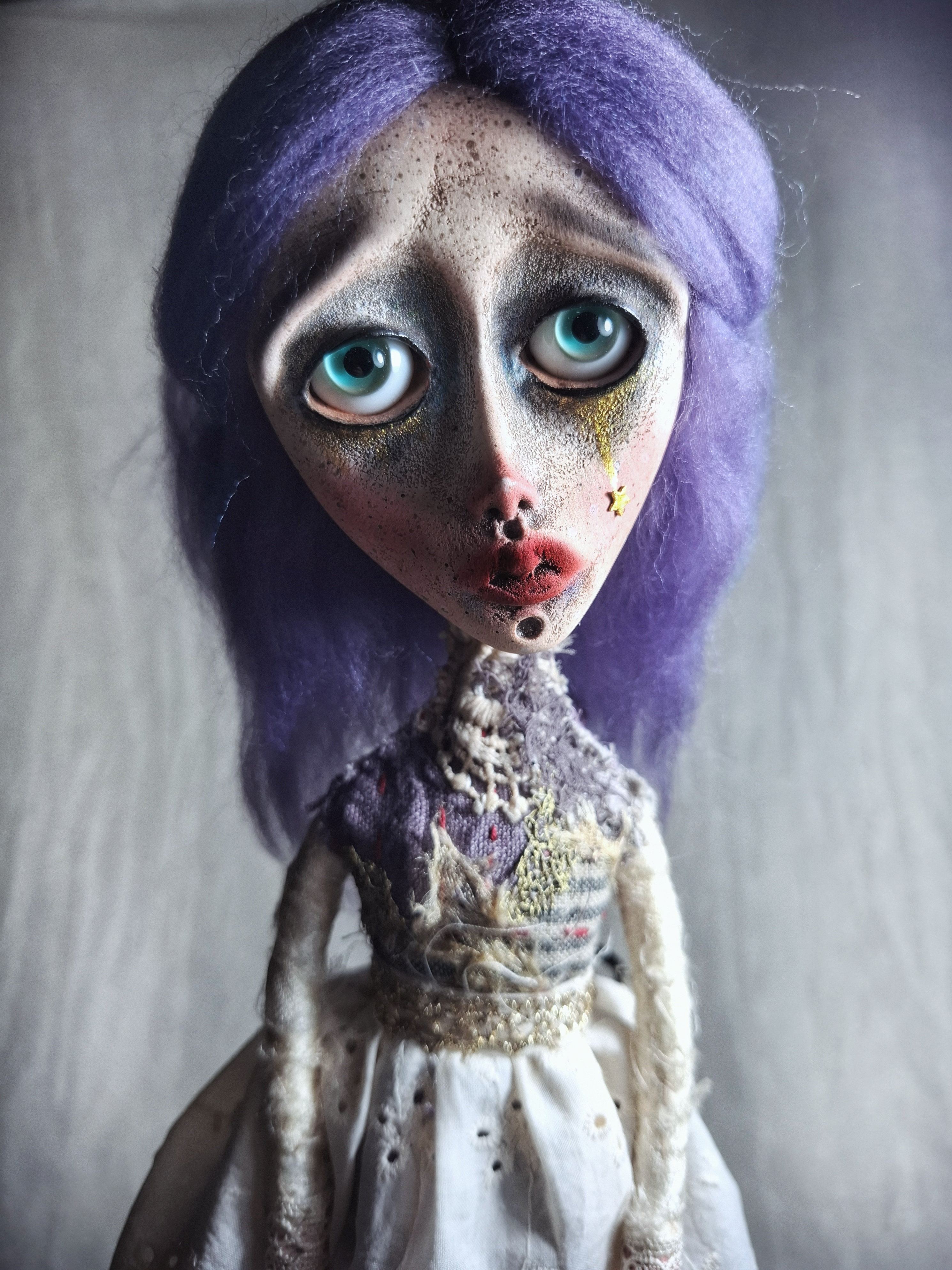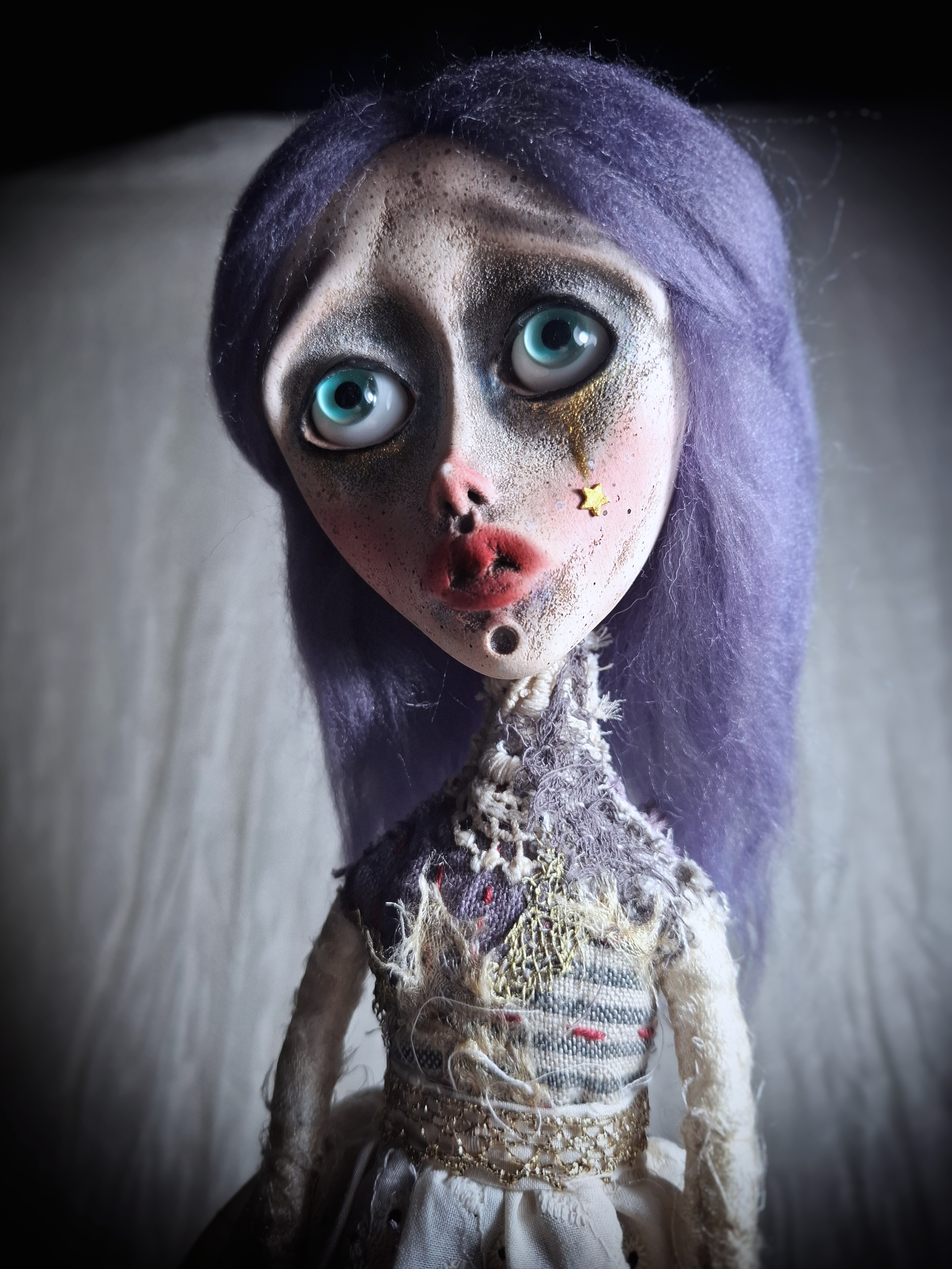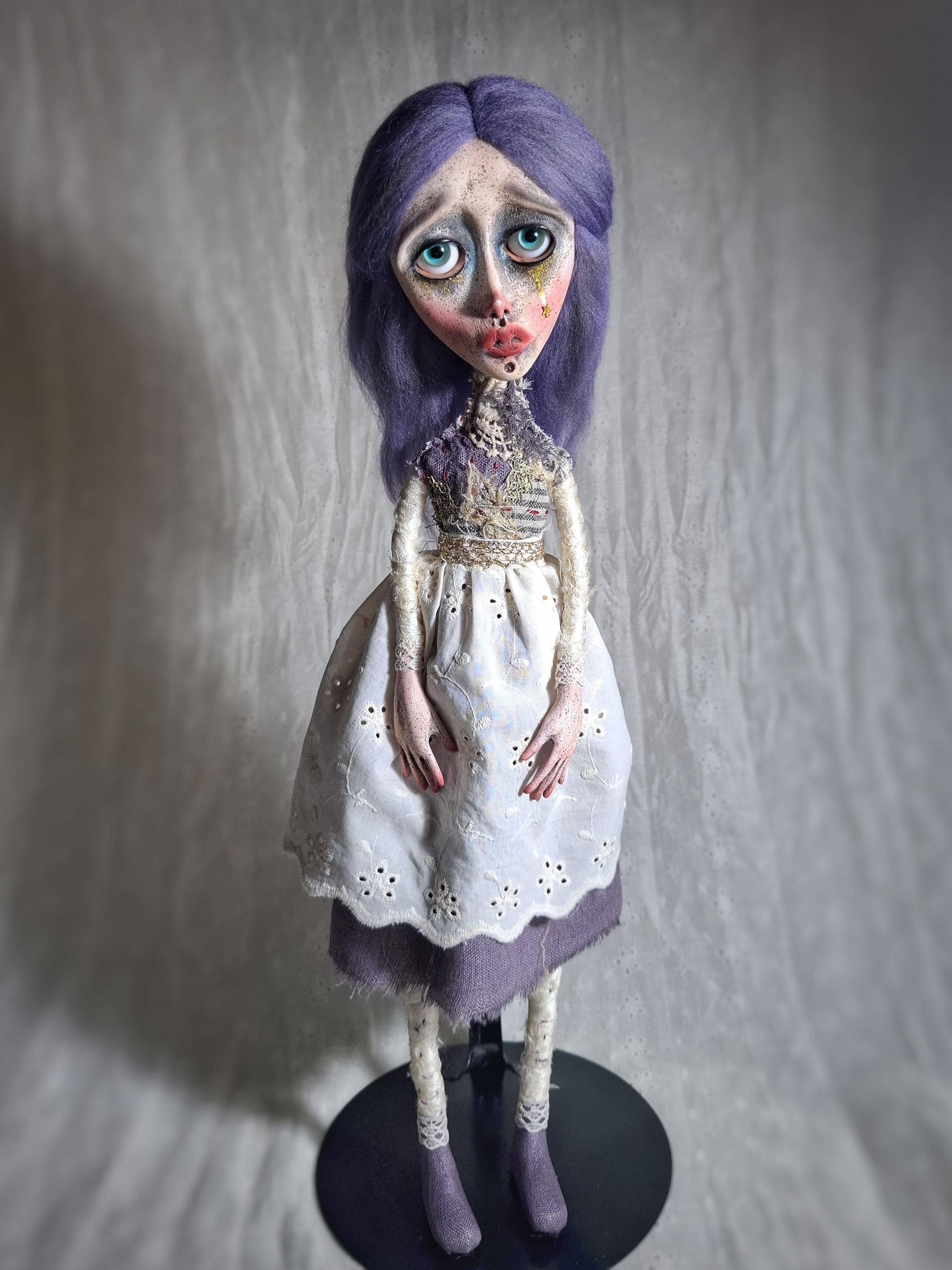 Mixed media: paperclay, polymer clay, variety of textiles, such as linen, cotton, silk, lace, trims and silk threads. She is painted with acrylics, soft pastels and colored pencils, and sealed with matte and gloss varnish. She can be displayed with a doll stand (not included), seated with some back support, or hang on the wall (loop included).