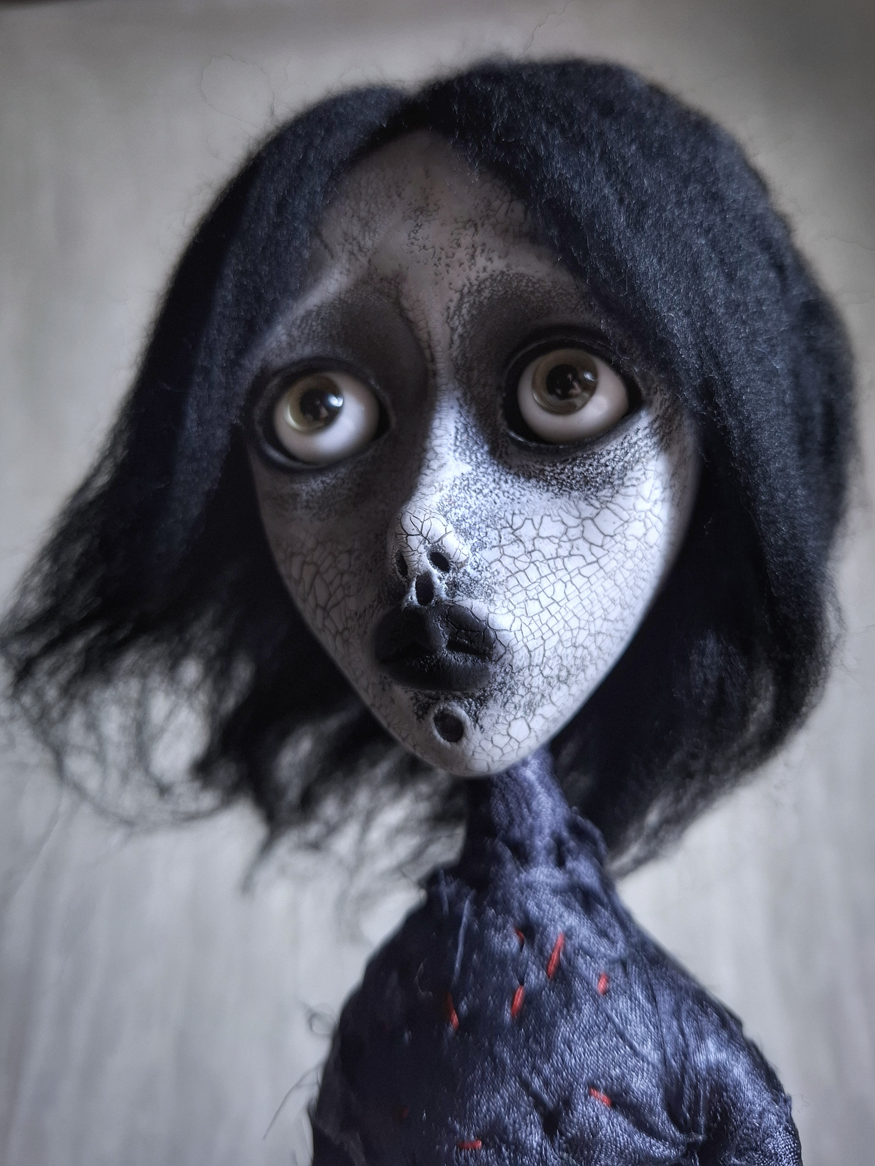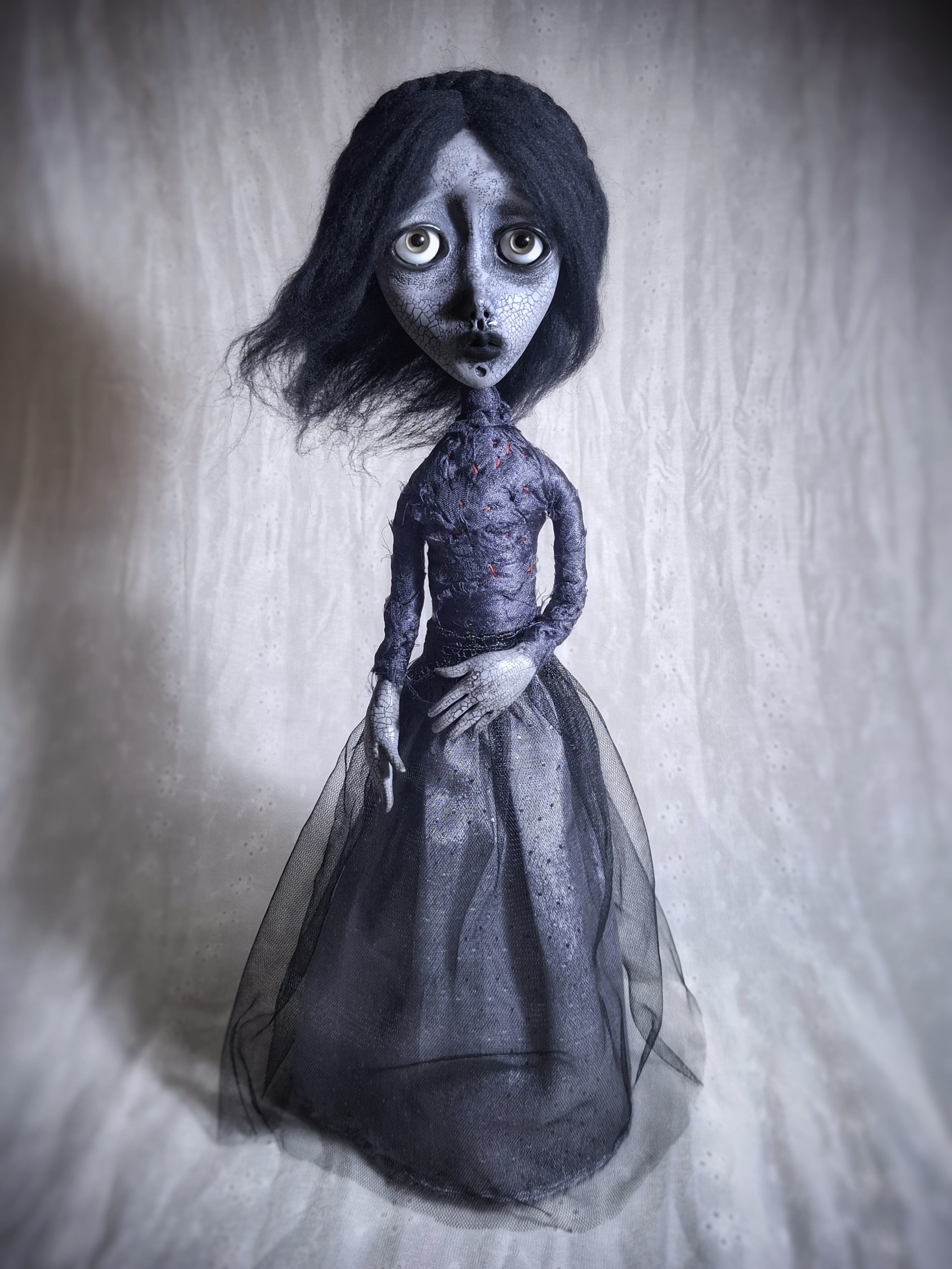 Mixed media: paperclay, polymer clay, variety of textiles, such as cotton, silk, tulle, felt, and silk threads. She is painted with acrylics, soft pastels and colored pencils, and sealed with matte and gloss varnish. She can be displayed standing on her own, as her skirt is functioning as a standing base.