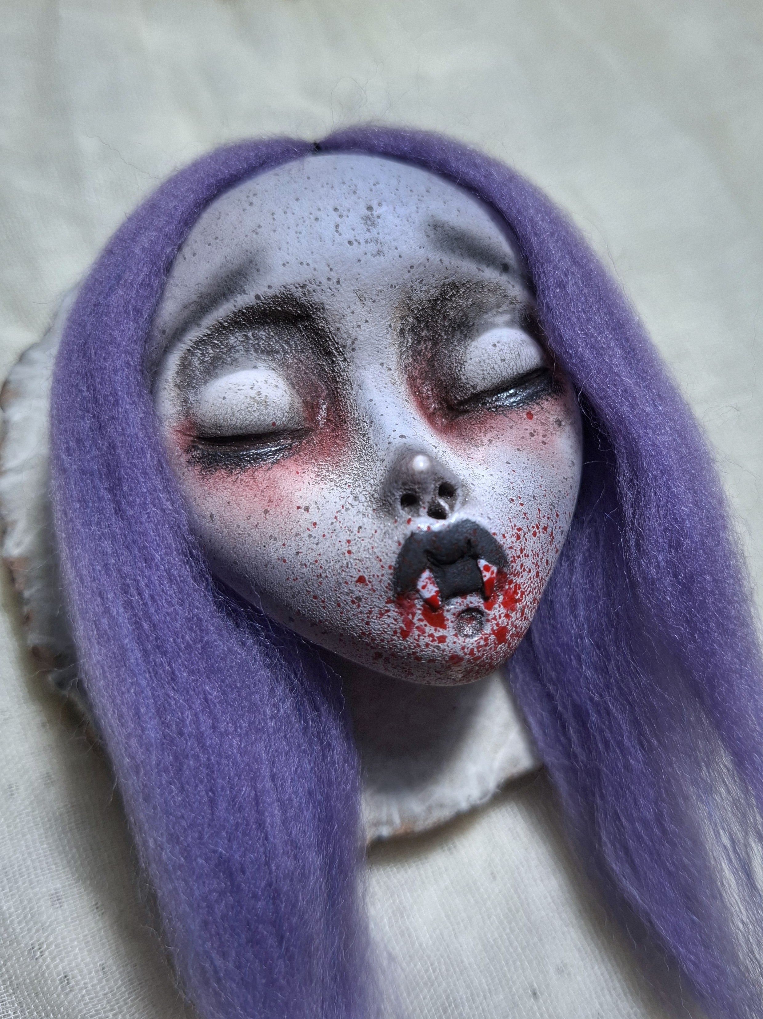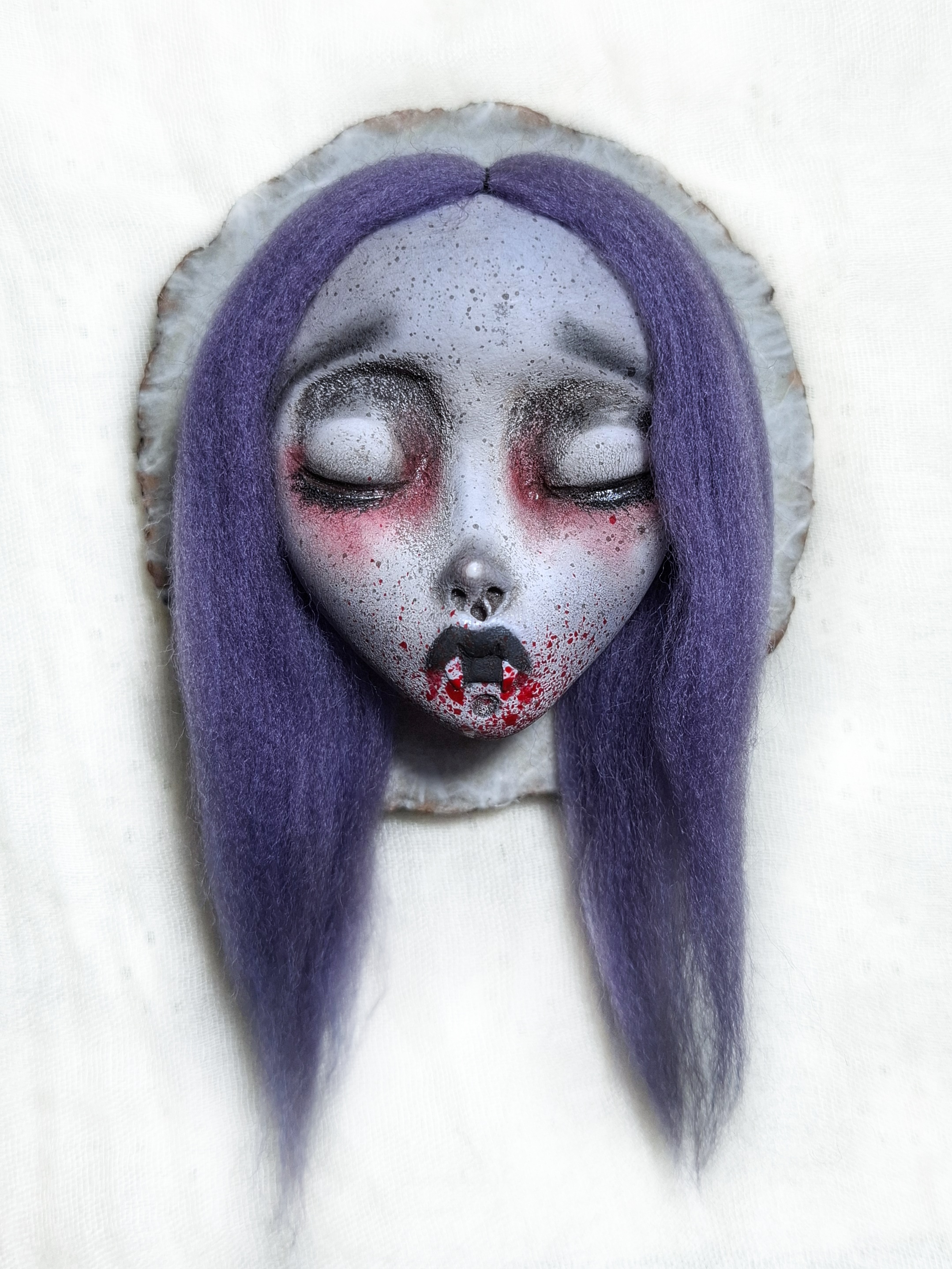 Mixed media: paperclay, merino wool, Japanese paper. She is painted with acrylics, soft pastels and colored pencils, and sealed with matte and gloss varnish.