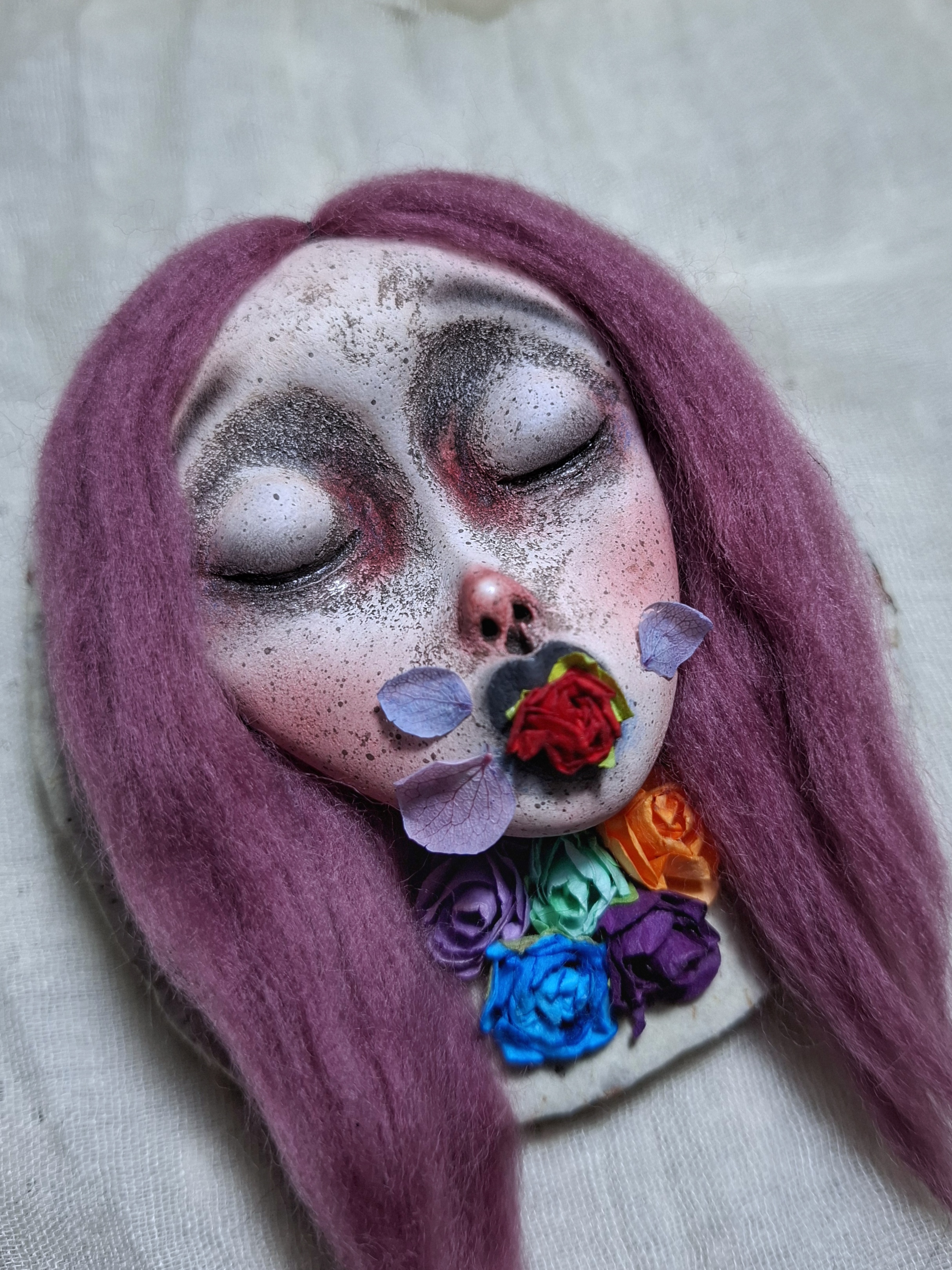 Mixed media: paperclay, dried and paper flowers, merino wool, Japanese paper. She is painted with acrylics, soft pastels and colored pencils, and sealed with matte and gloss varnish.
