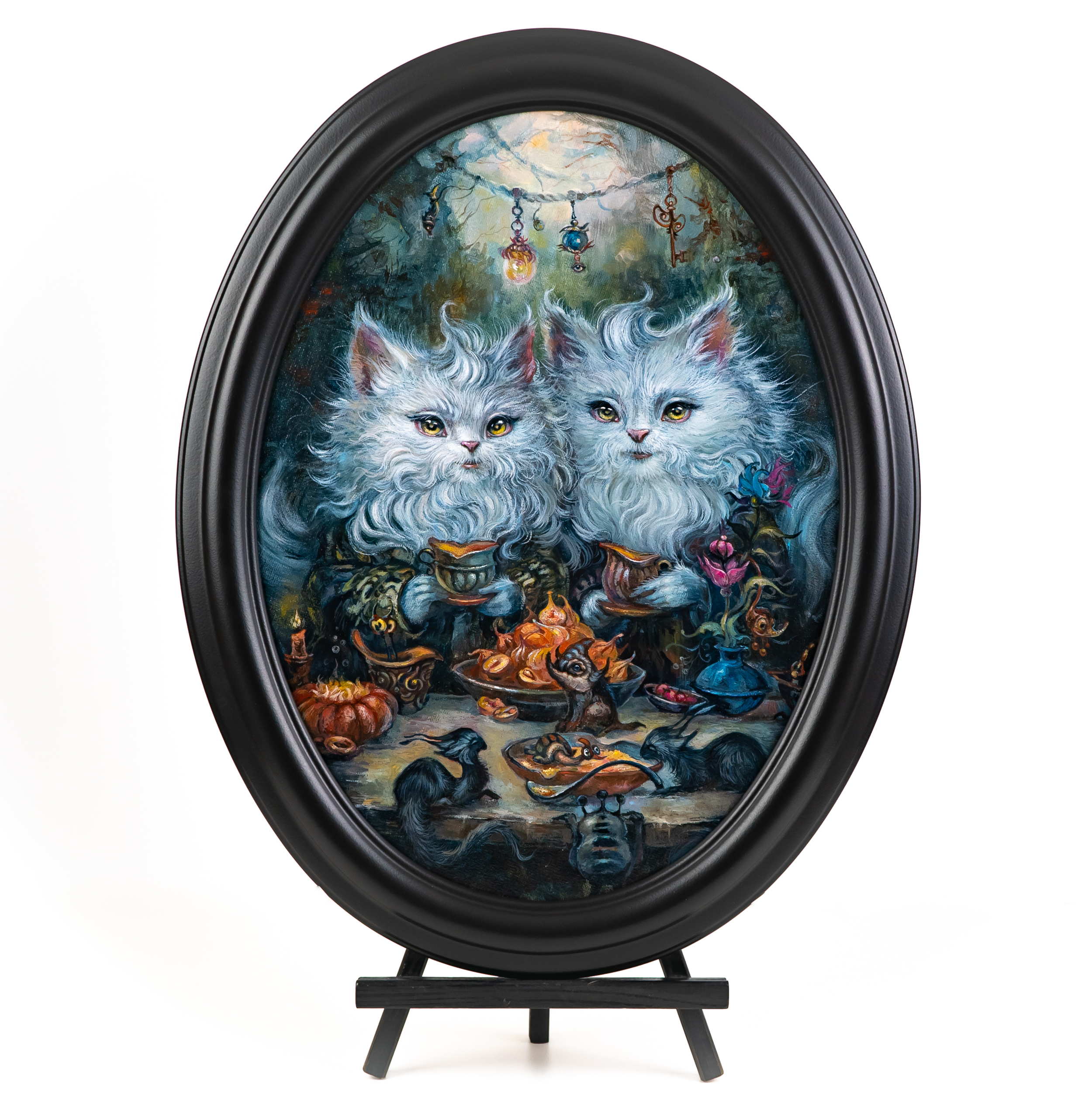 Medium: Acrylic+oil on hardboard, varnish, wooden frame