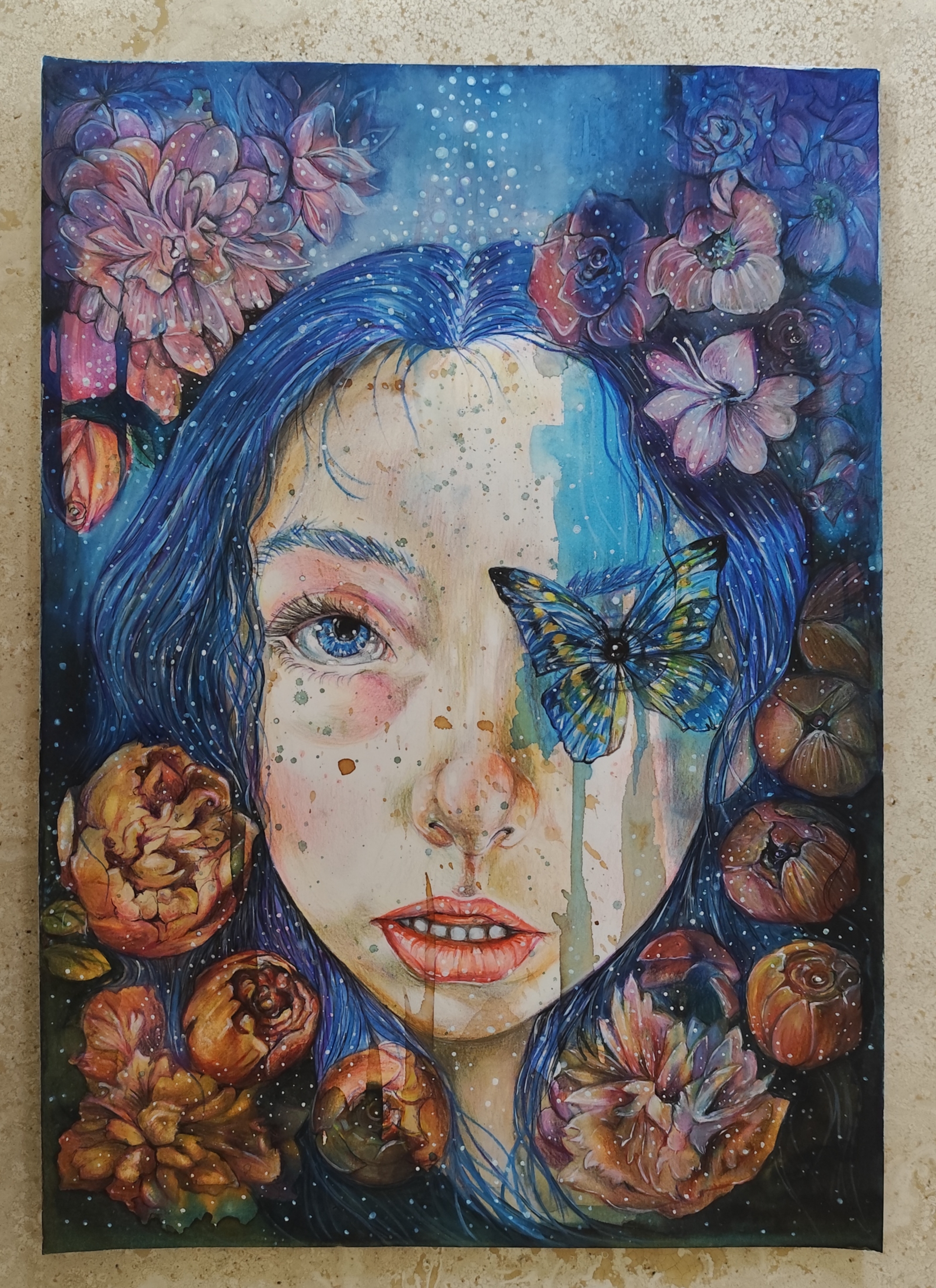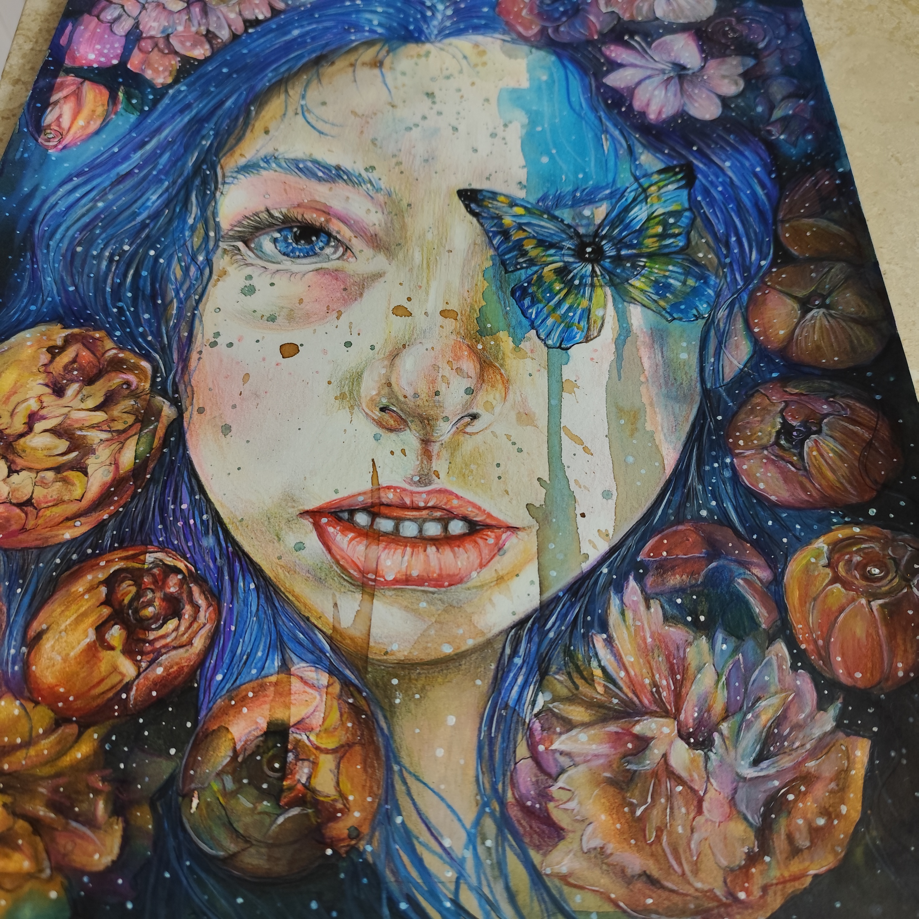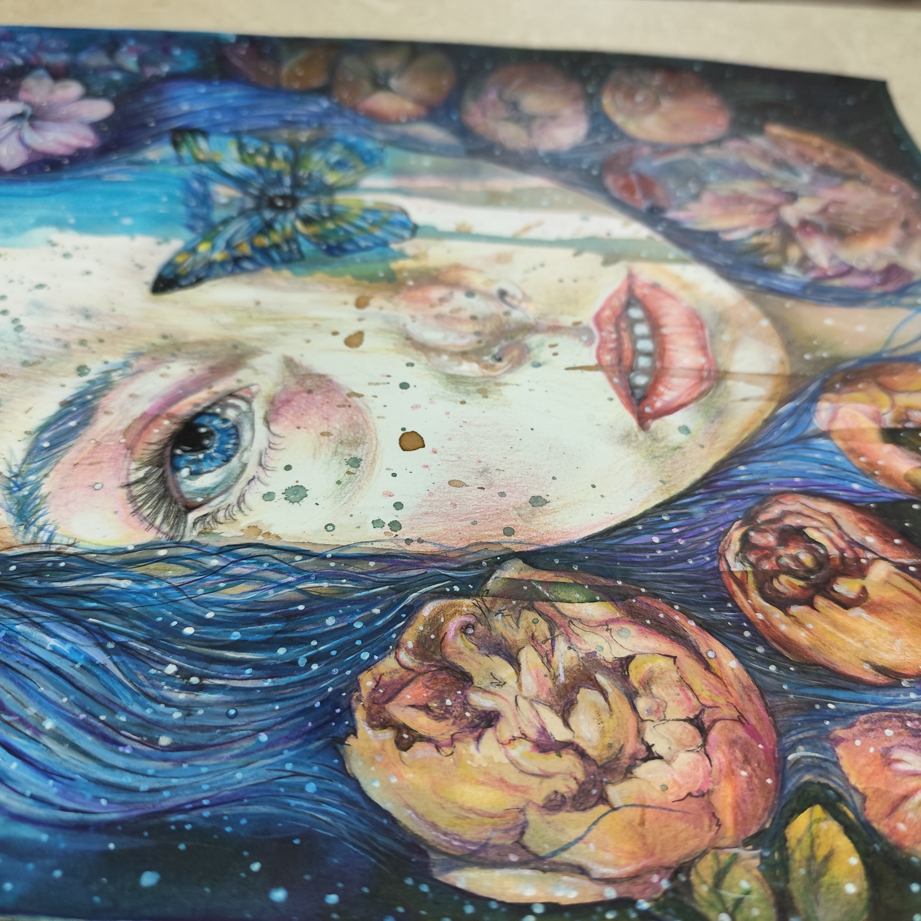 Medium: Mixed media (stain, colored pencils, acrylic, and ink)