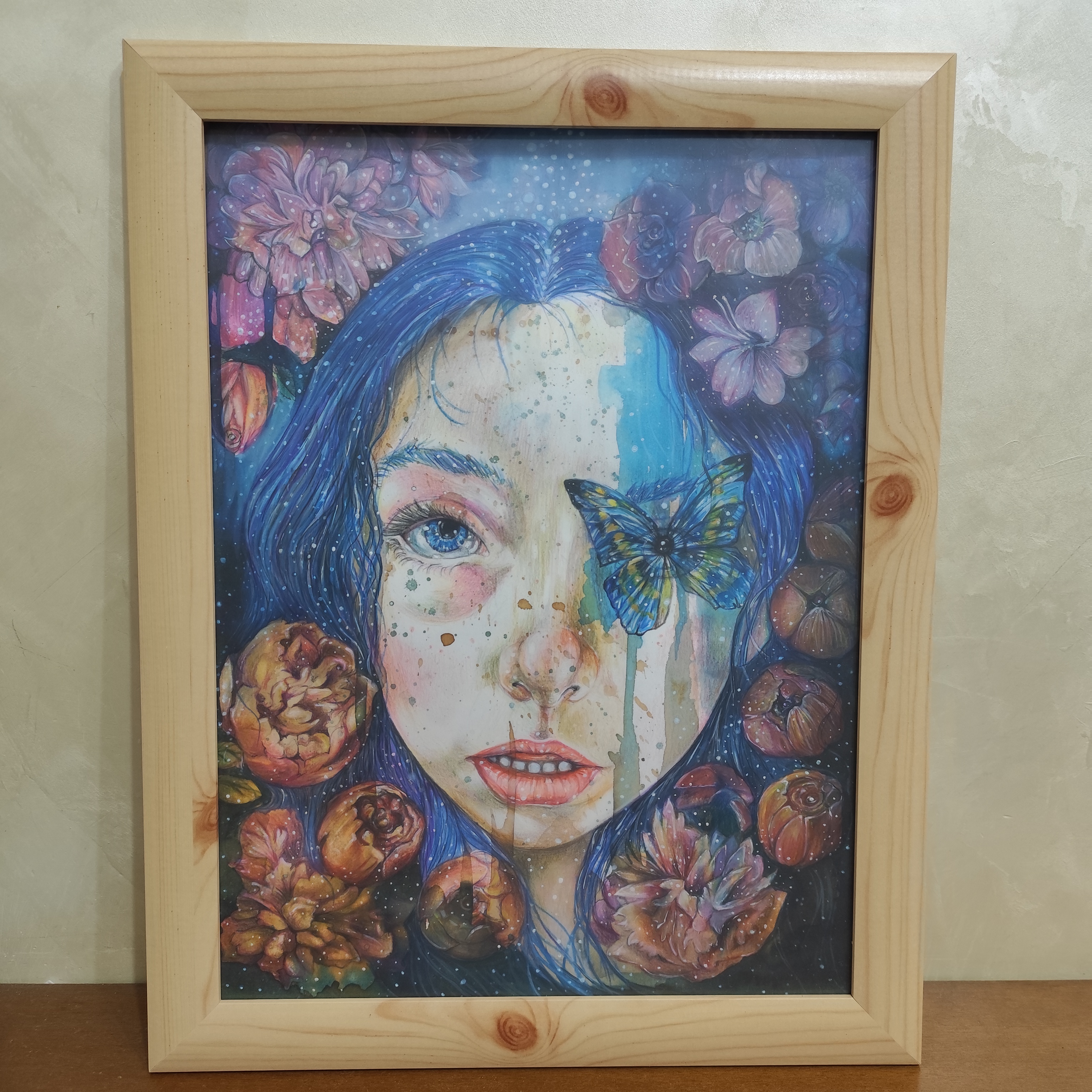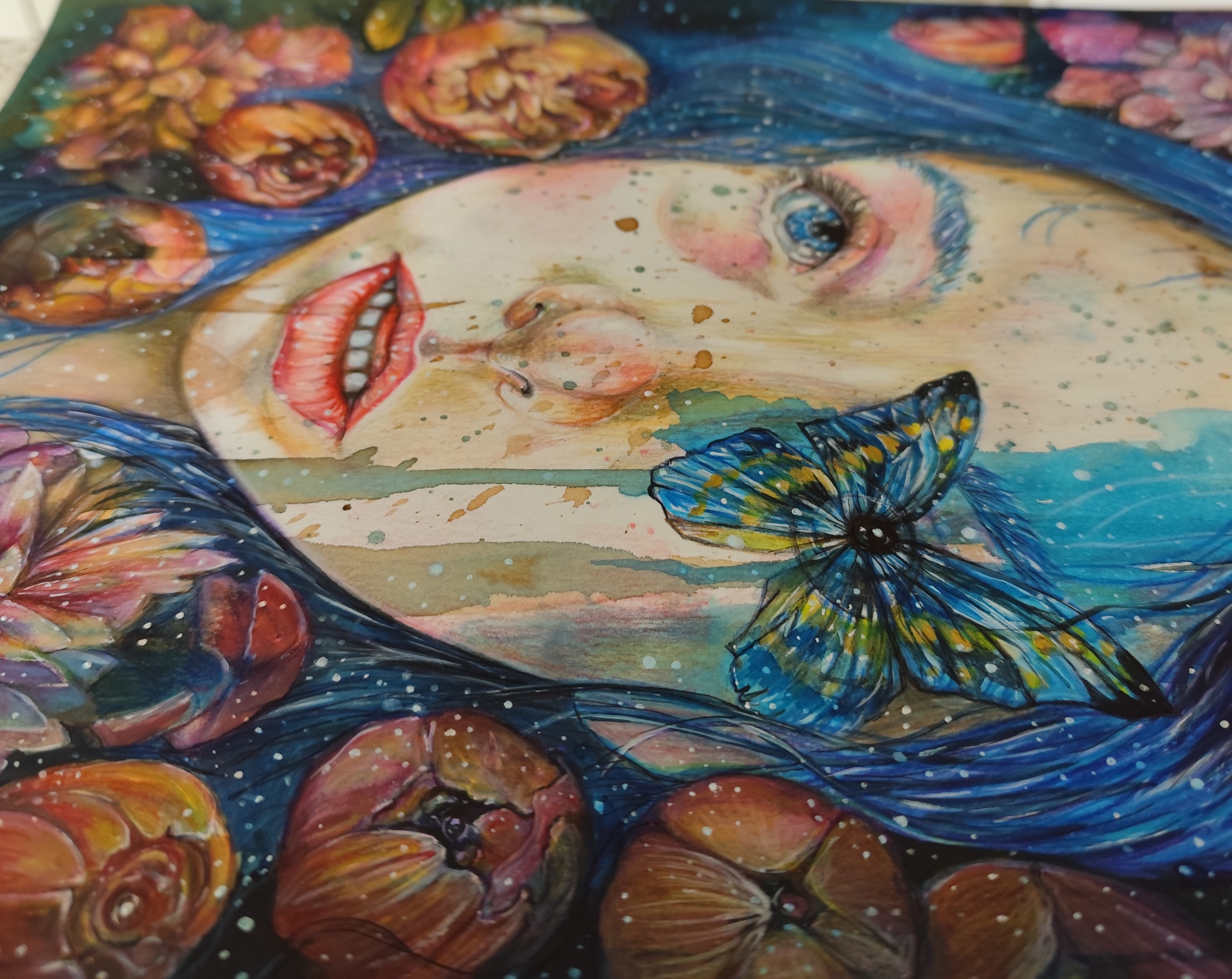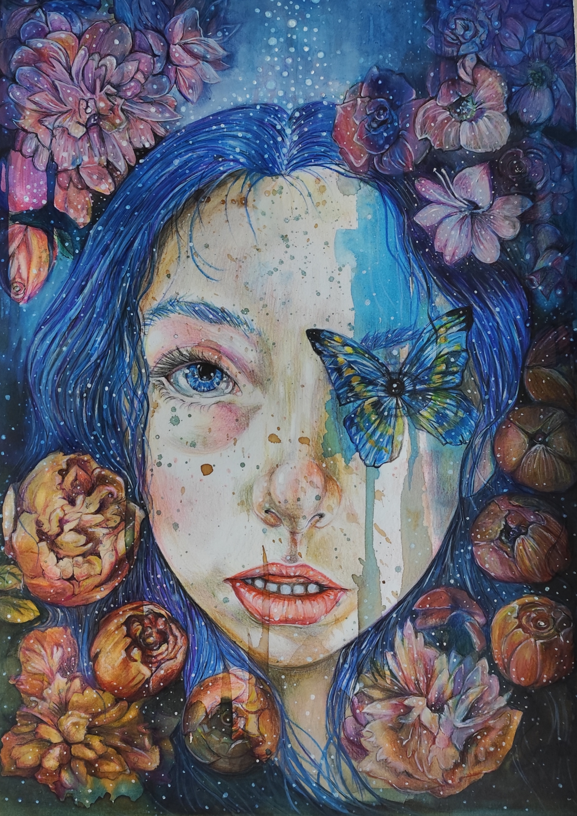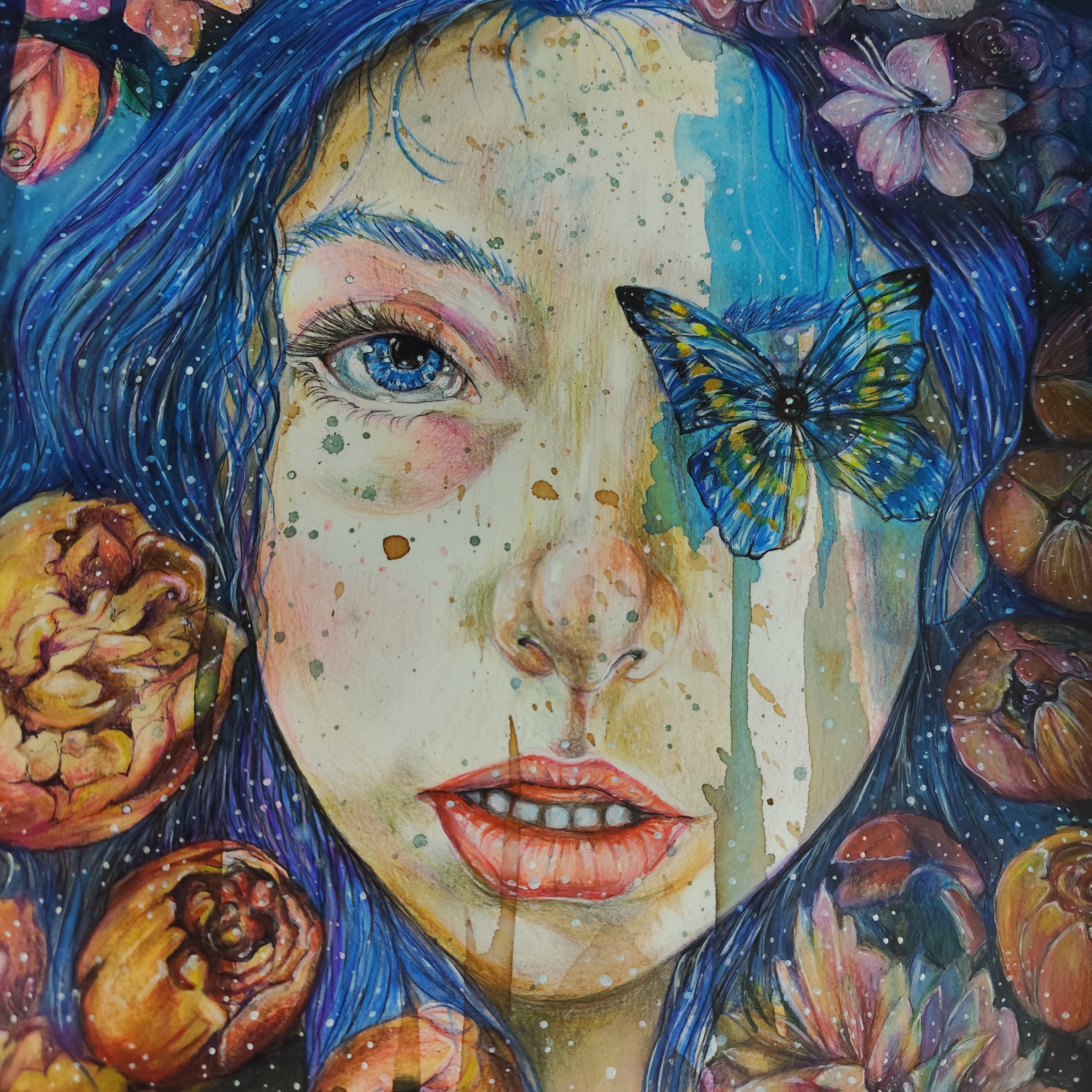 Medium: Mixed media (stain, colored pencils, acrylic, and ink)
