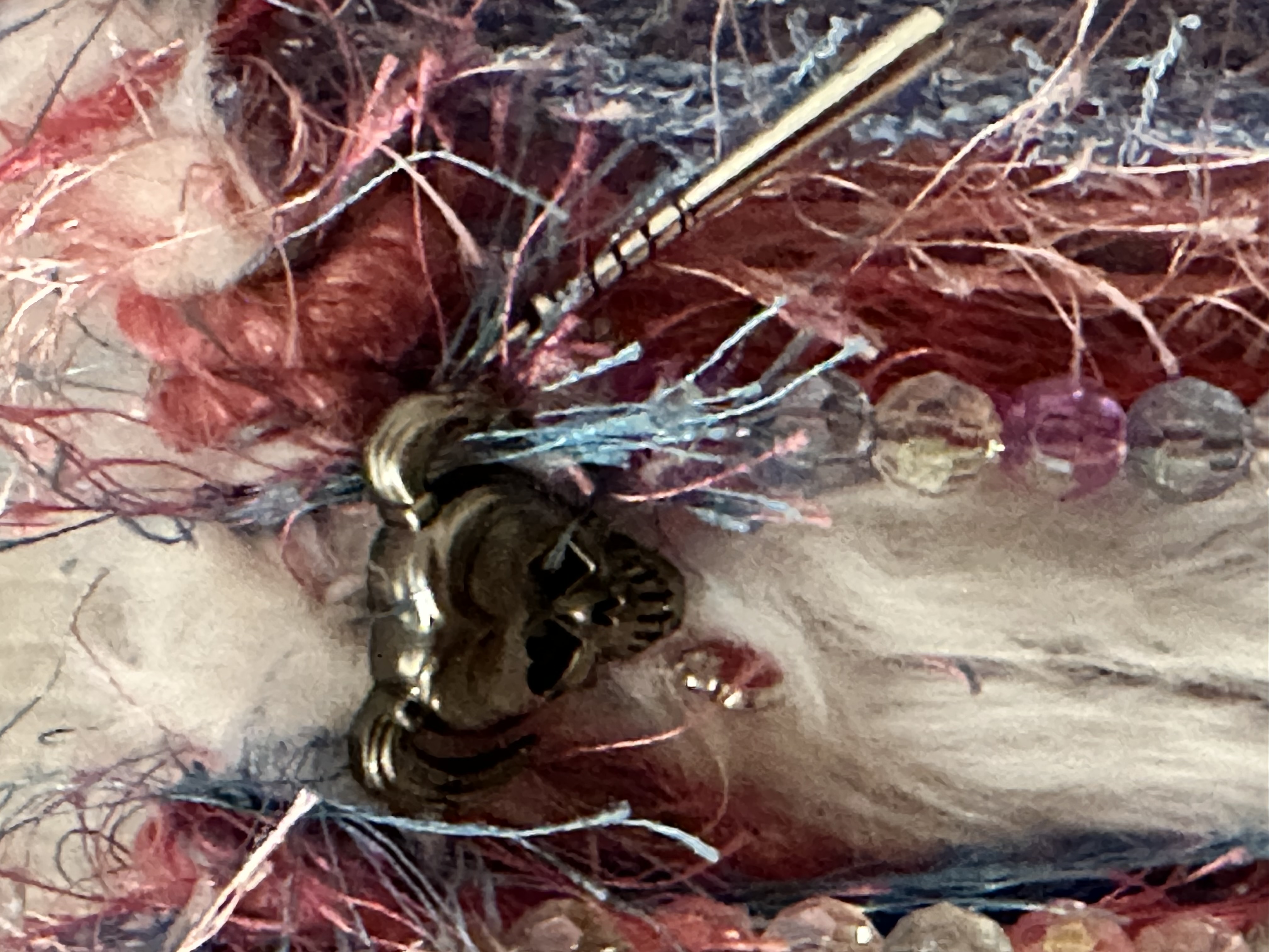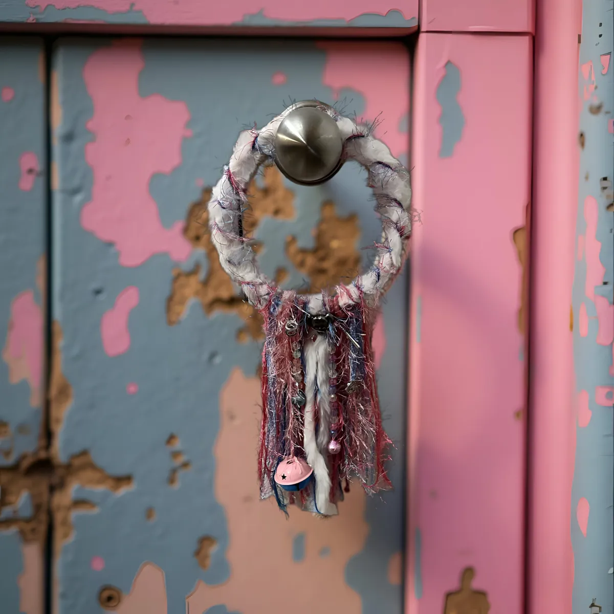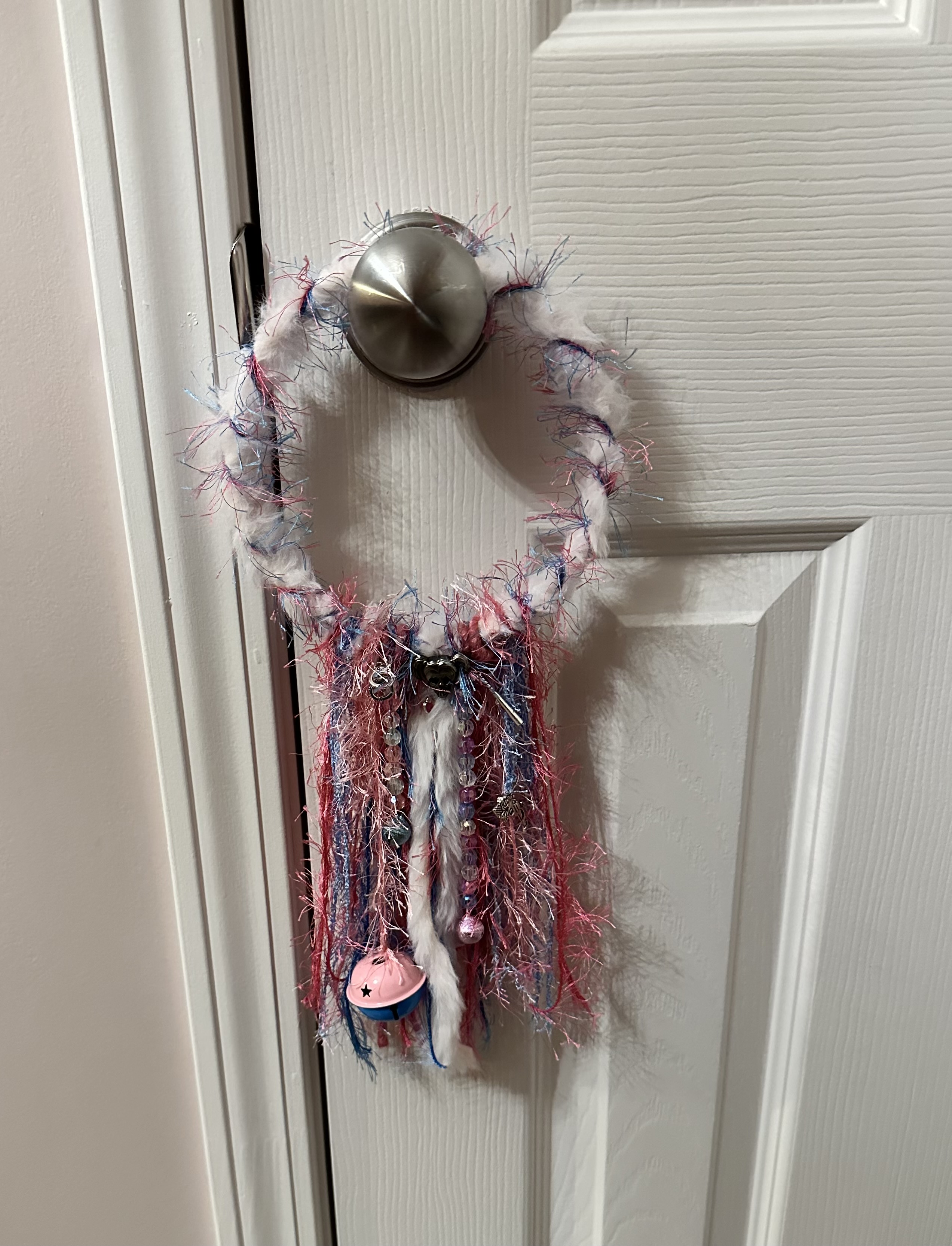 This was created in shades of pink and blue with with beads and bells in the same color scheme.