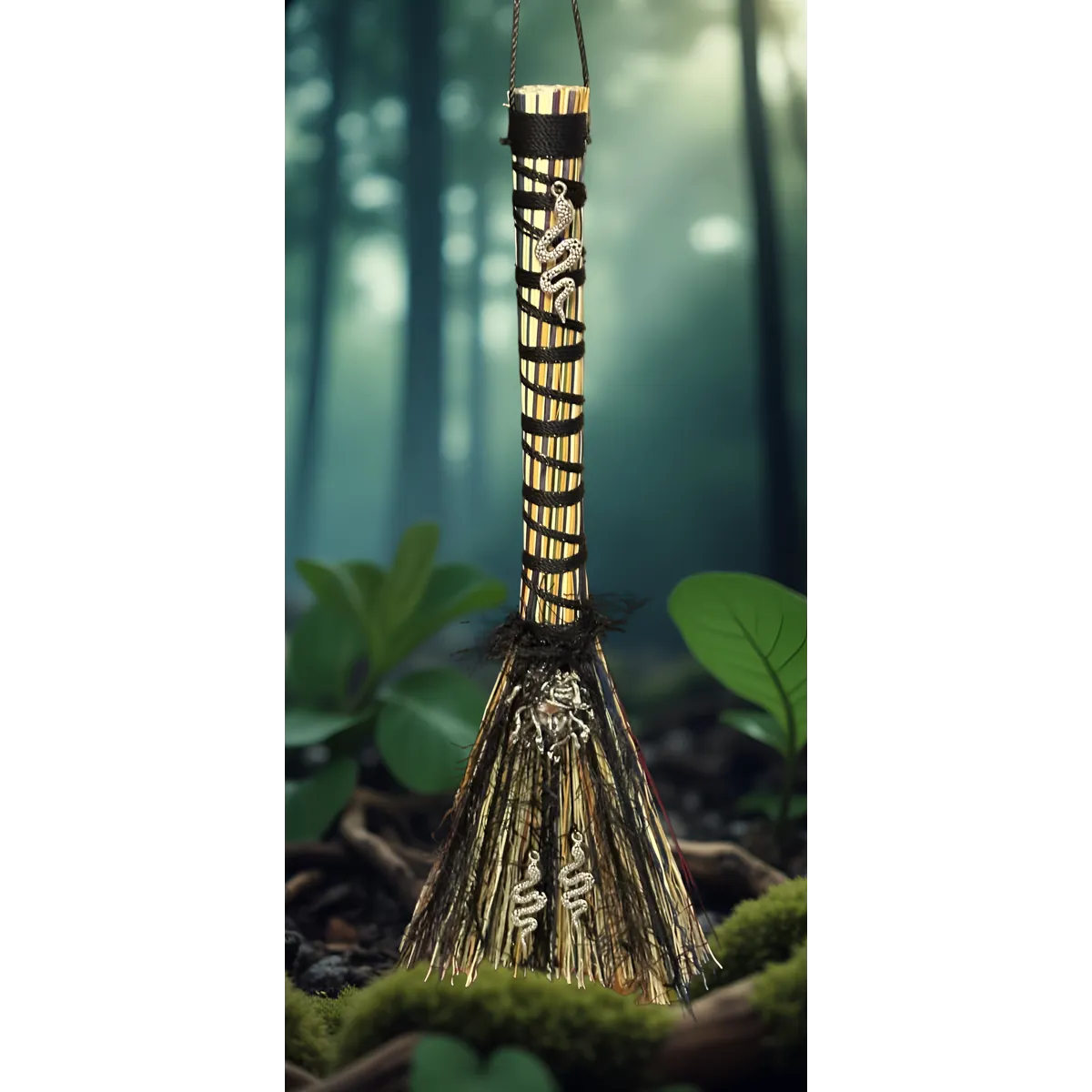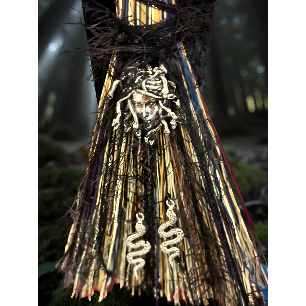This can hang on a wall or lean on a shelf, fireplace, or door frame. It is made from a combination of regular and dyed broomcorn and tied with black chord and black accent yarn. It is adorned with 3 silver colored metal snakes and has a focal charm in a gunmetal silver color that showcases Medusa and her hair of snakes.