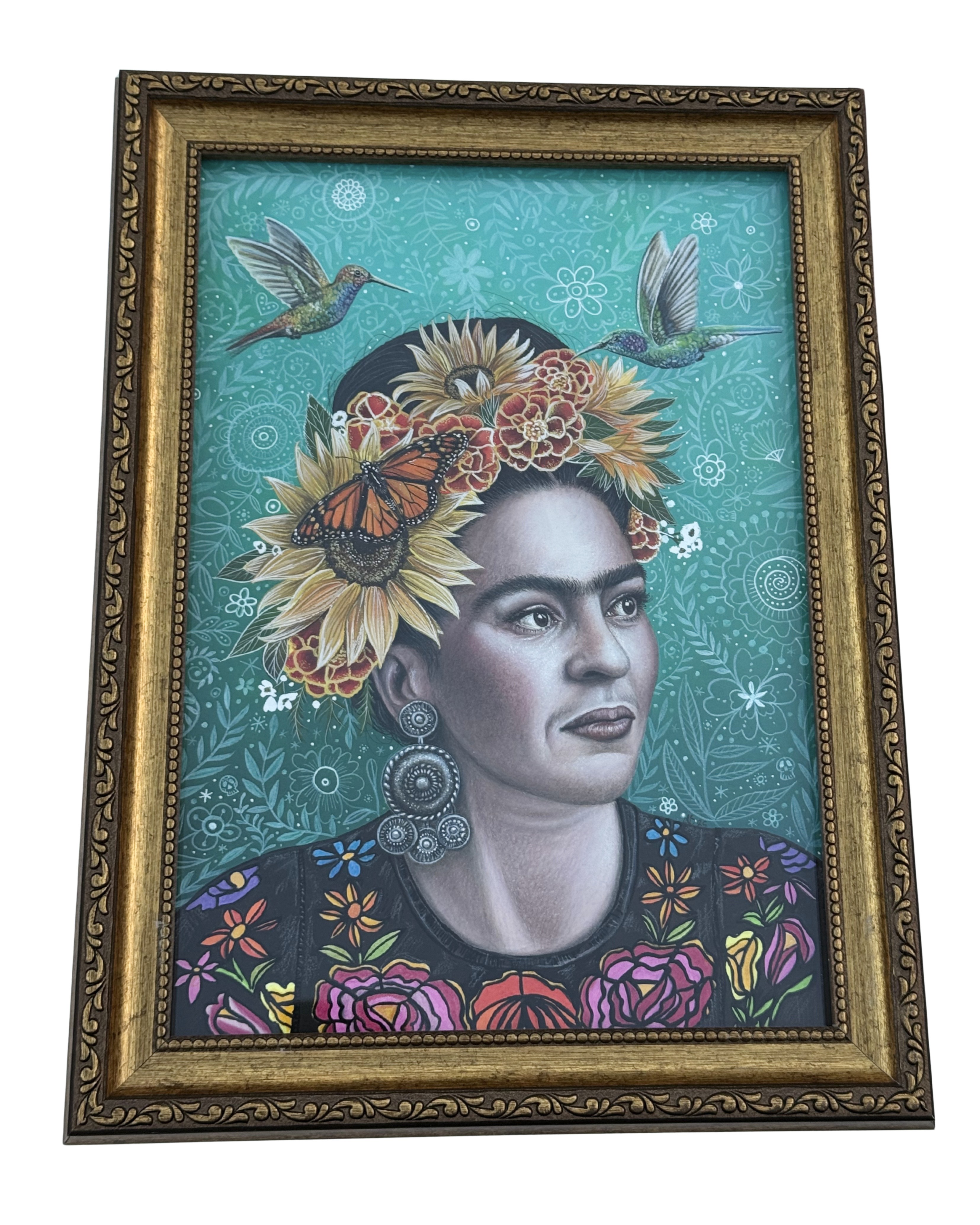 Jodie describes sitting in meditation with the theme of Día de los Muertos, when Frida herself seemed to appear, a fitting muse whose life and art embraced both suffering and celebration. The flower crown of marigolds, sunflowers, hummingbirds, and a Monarch butterfly reflects the vibrancy of Frida’s altars, filled with colour, memory, and love.
