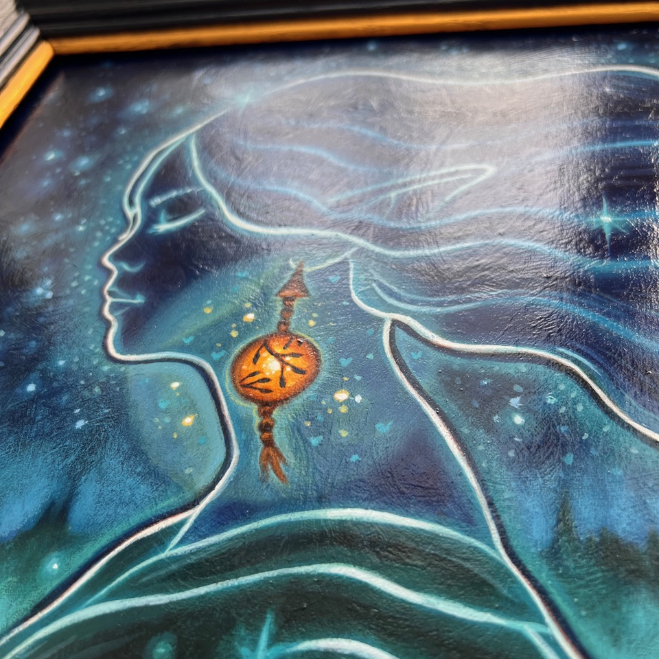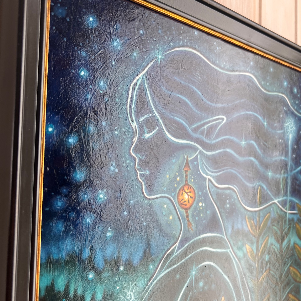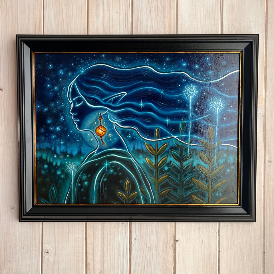 "I would describe my painting as a subtle, ethereal presence in this enchanting nature. You can feel it, like a shiver, but it blends into nature. It becomes a fragrance. A moonless night atmosphere. A lantern, like a glimmer, discreetly announces its presence."