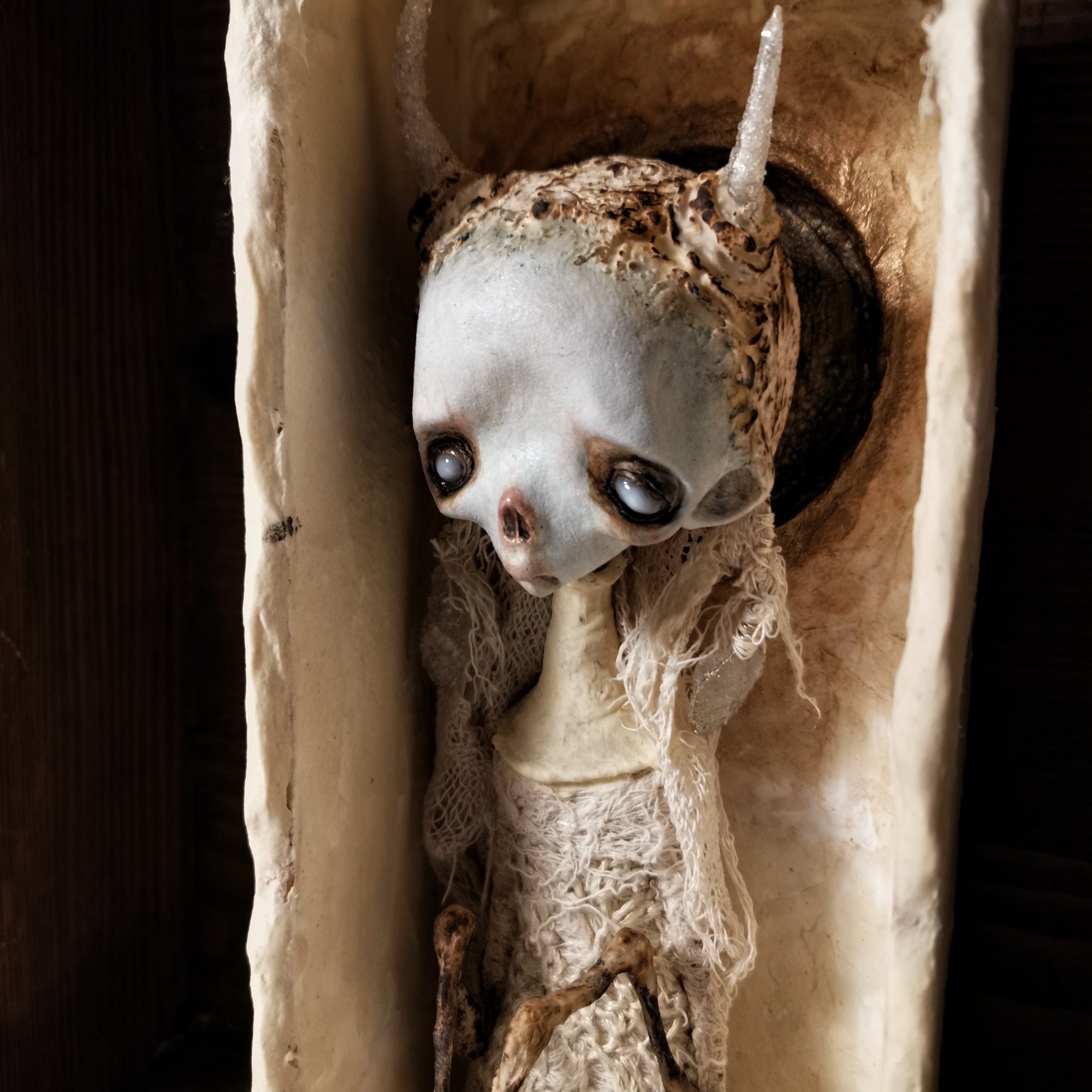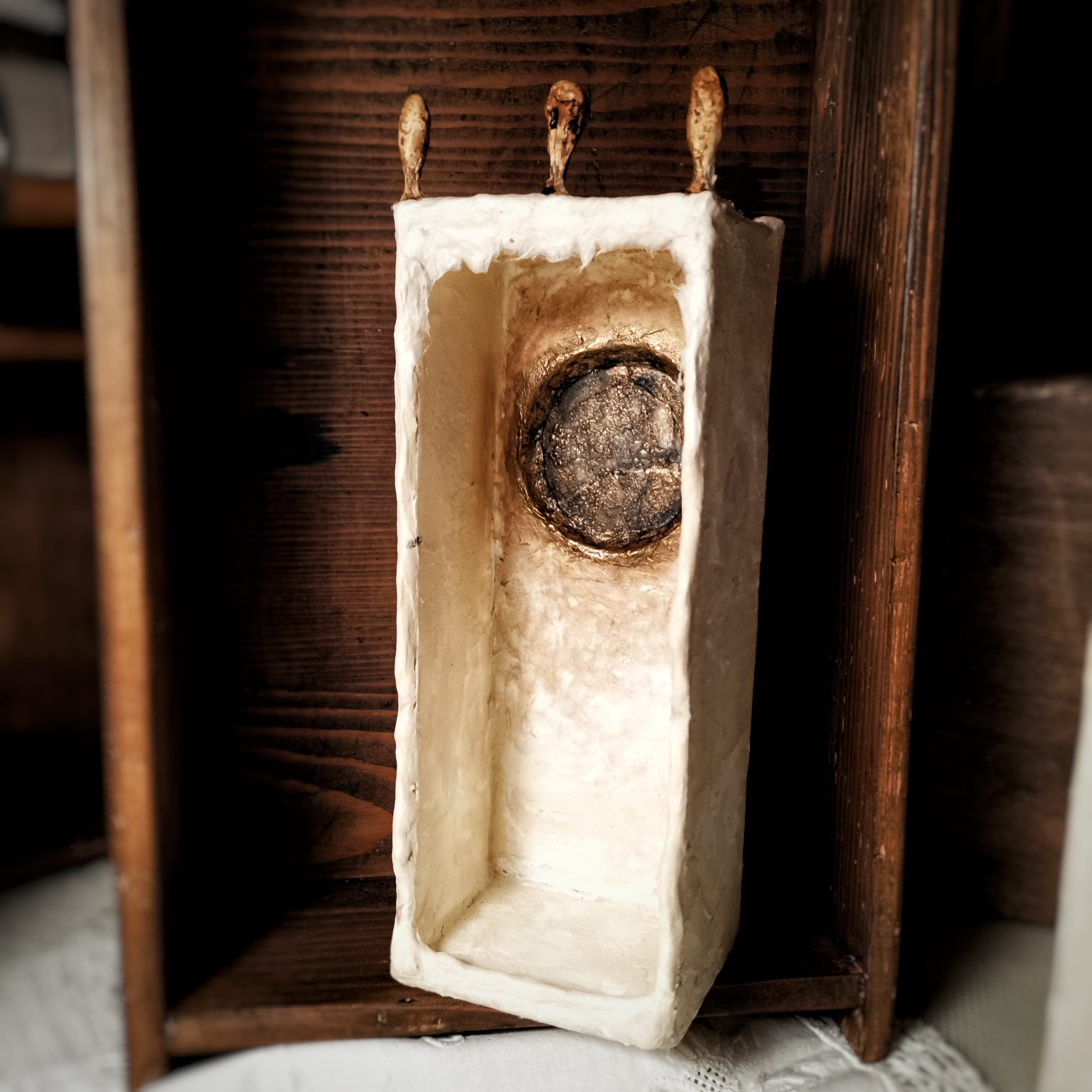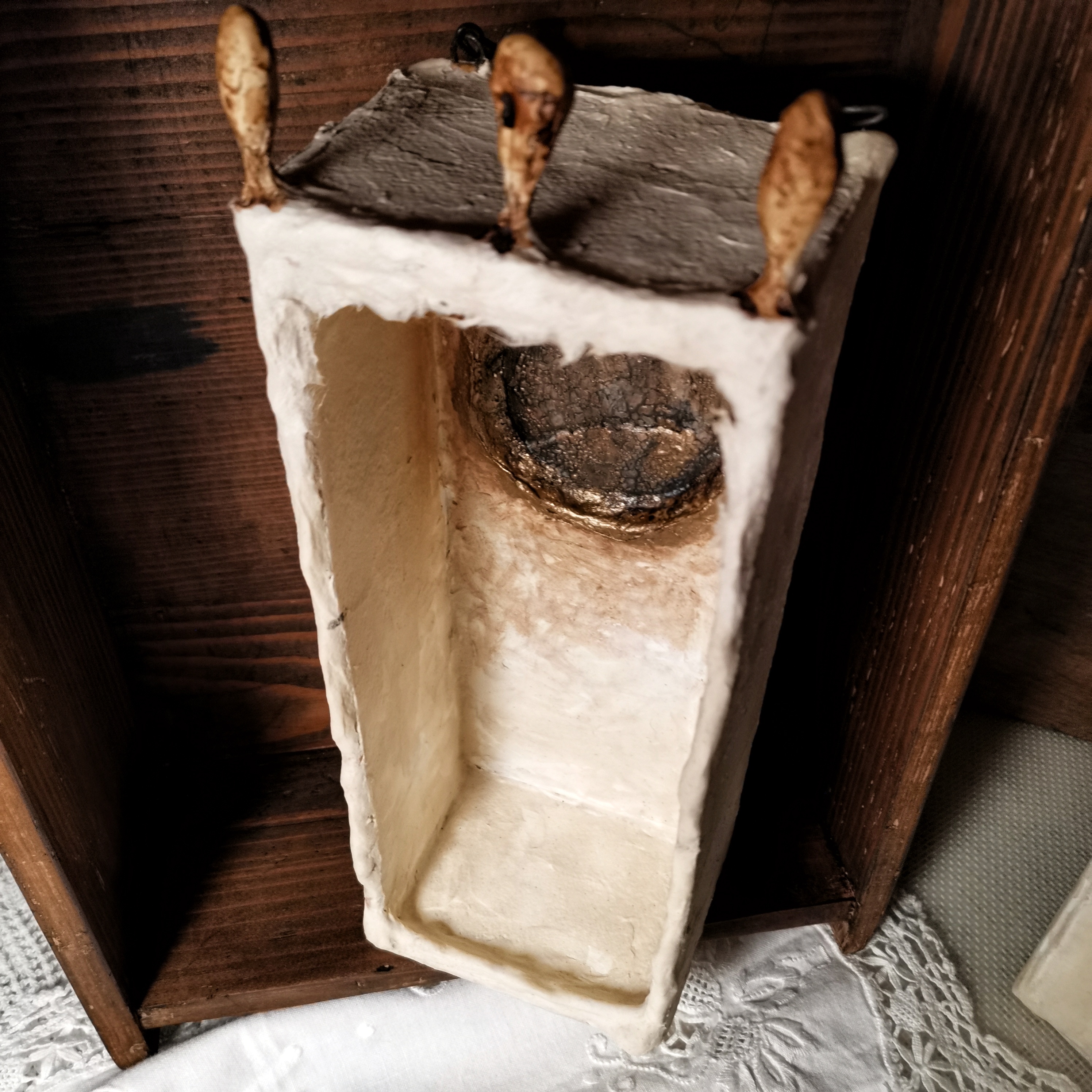 Medium: Paperclay, papermache clay, cotton fabric, resin