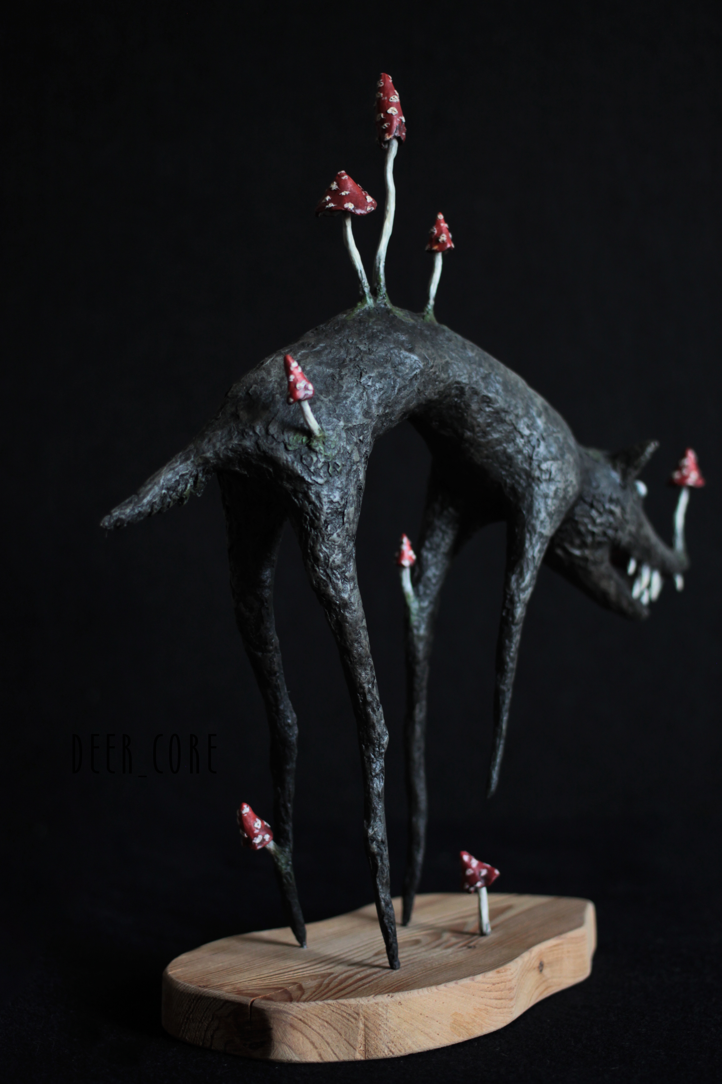 This sculpture presents a liminal creature, a three-legged wolf overtaken by fly agaric mushrooms. Suspended between decay and transformation, the animal exists in an ambiguous state: both animate and inert, familiar yet unmistakably altered.