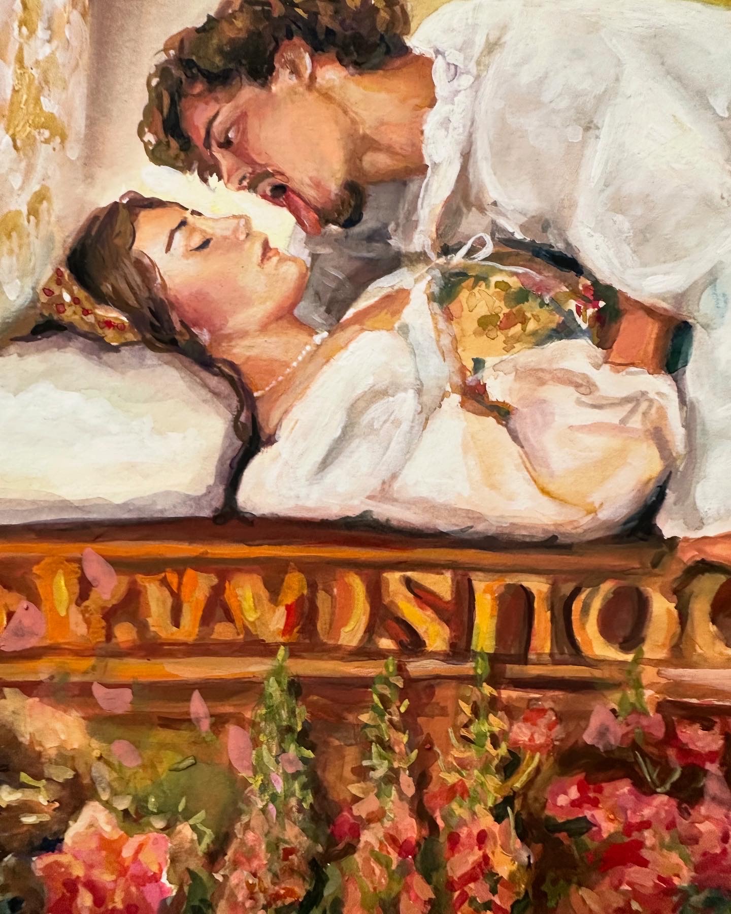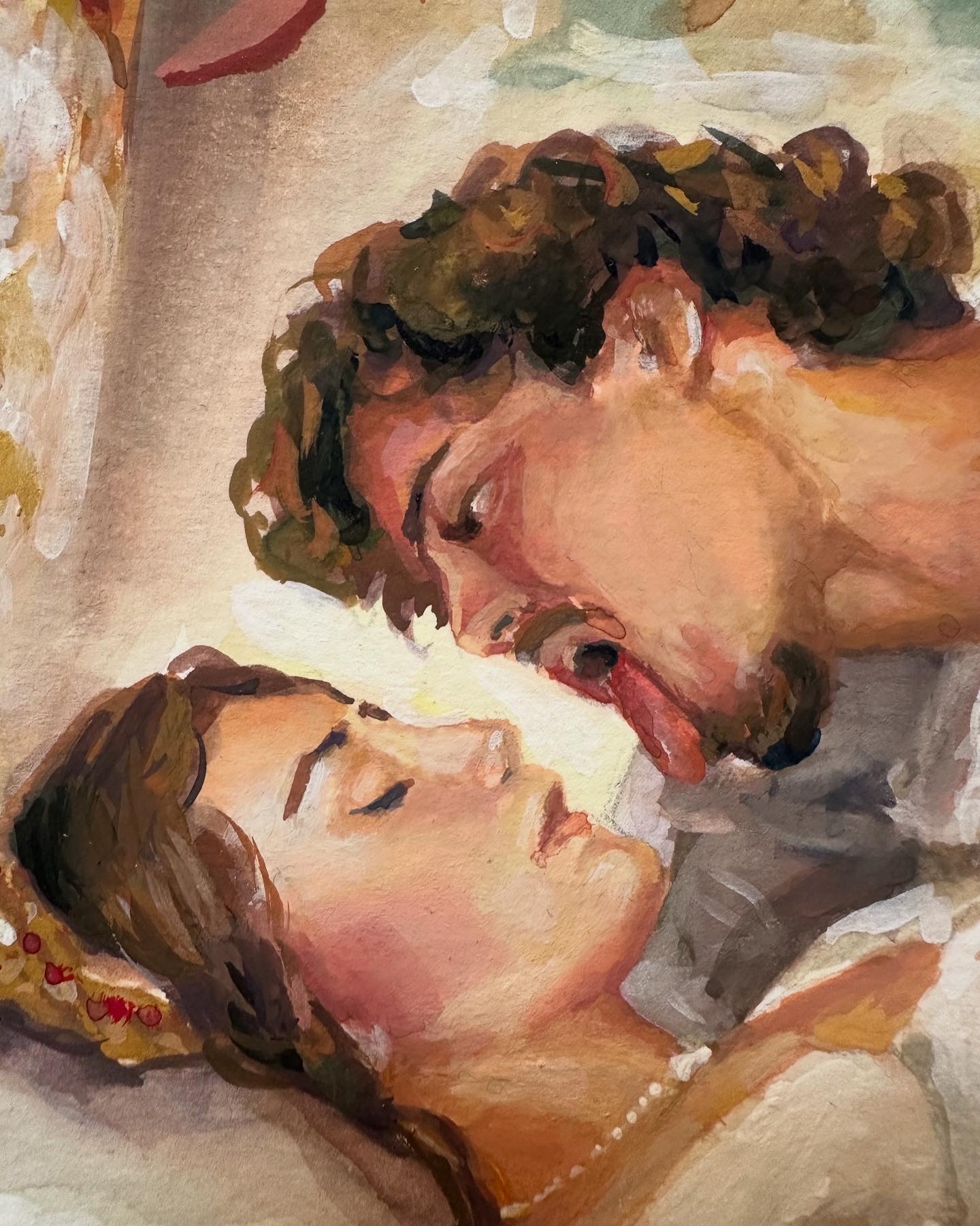 This painting speaks about that violent interruption between fantasy and reality, that moment when the pink world of princesses collapses and gives way to the modern dating world of likes, matches, and fleeting affections that evaporate in seconds.
