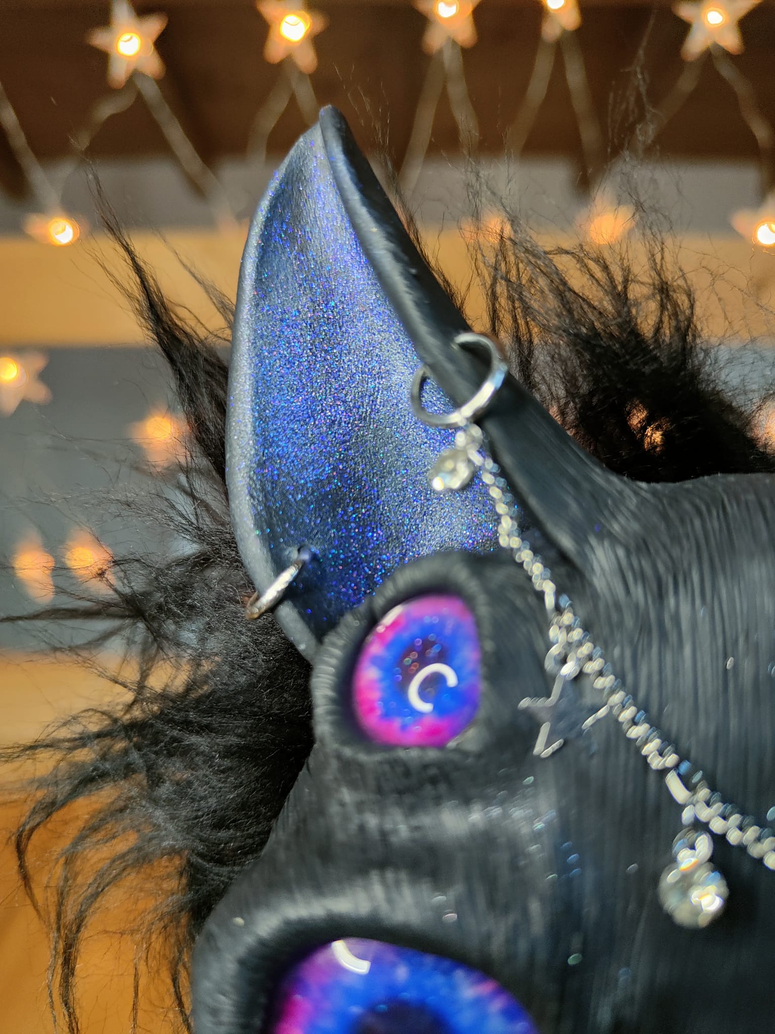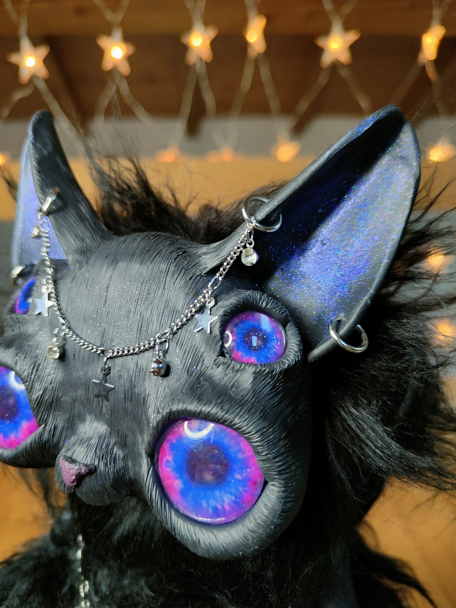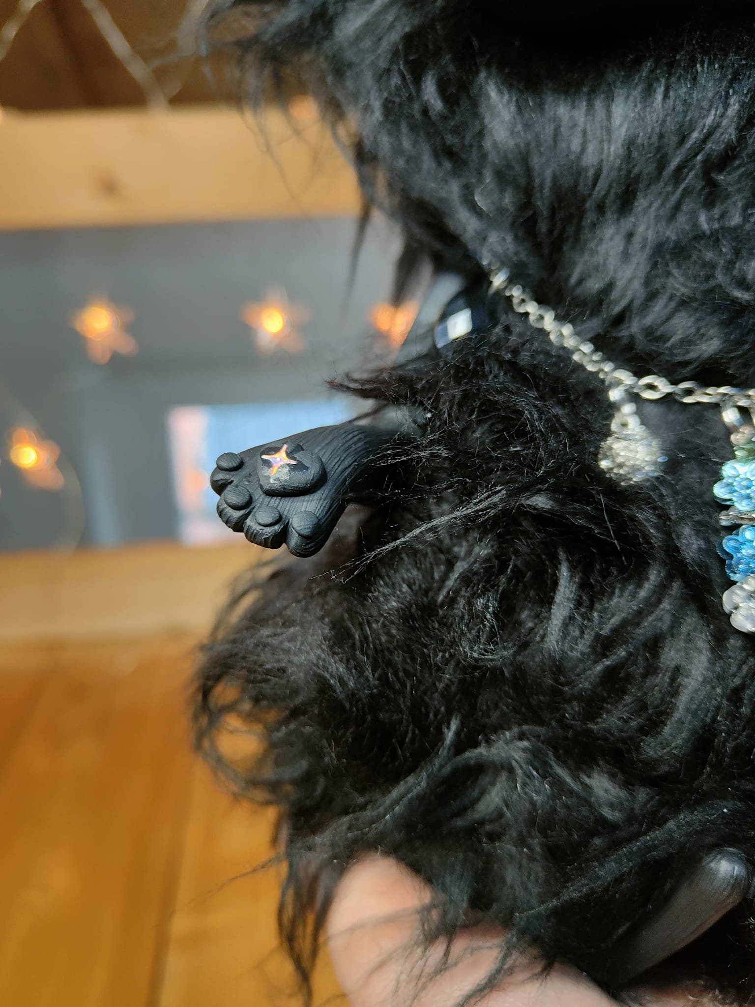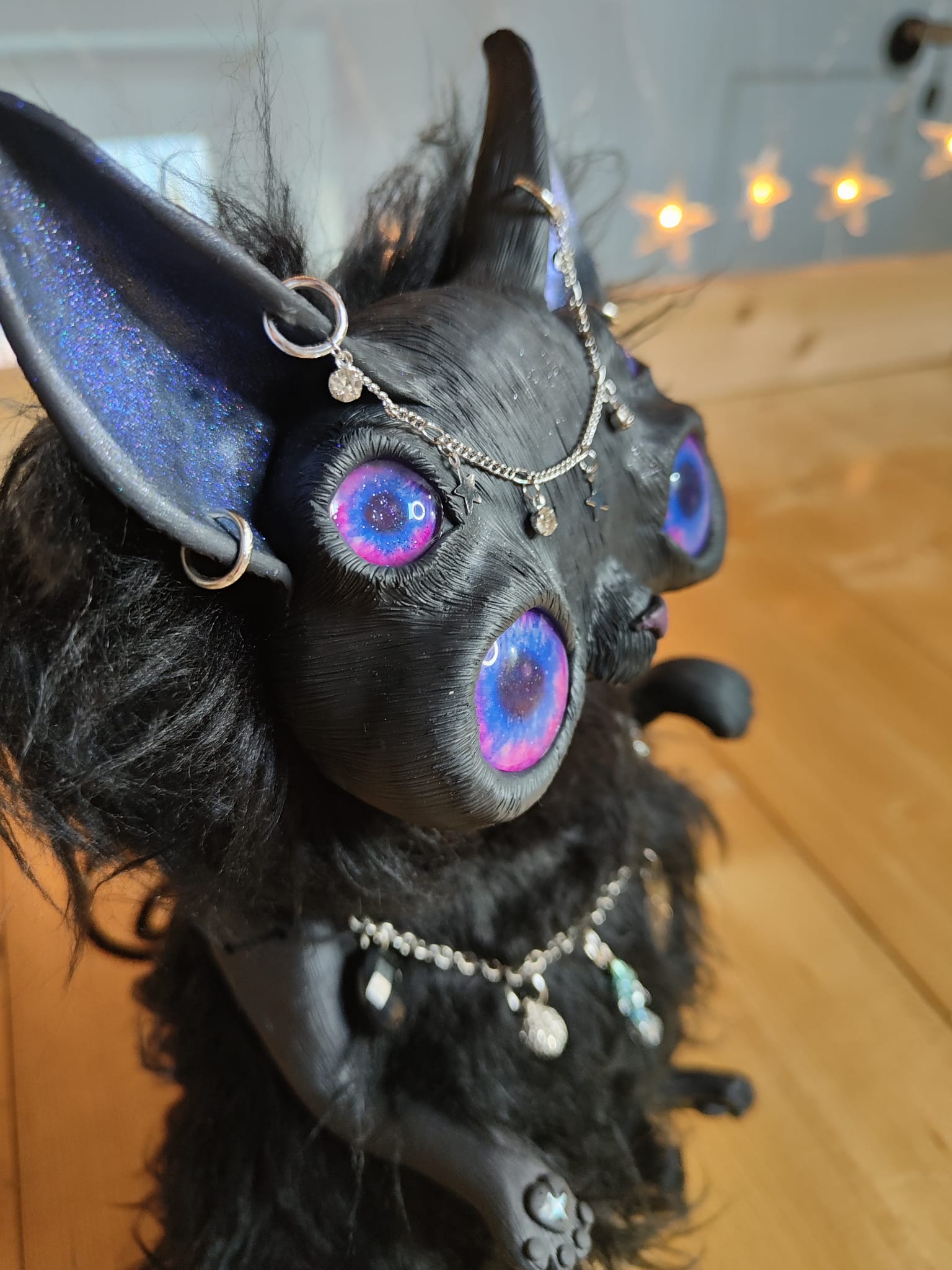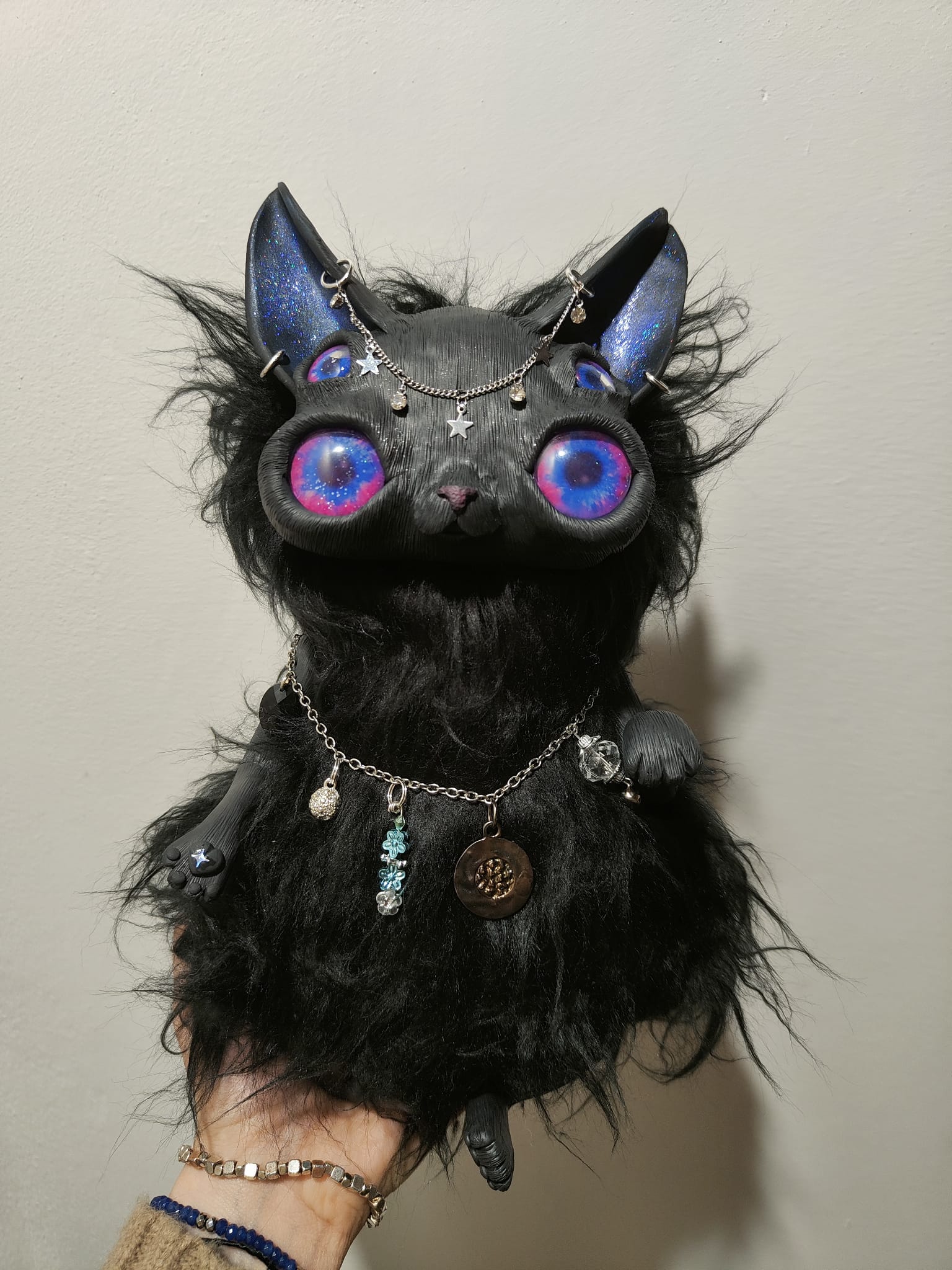 Medium: Mixed media, flexible polymer clay, glass, synthetic fur, glass and plastic beads, small zircons, glitters, stainless steel chain, scented sand and pebbles.