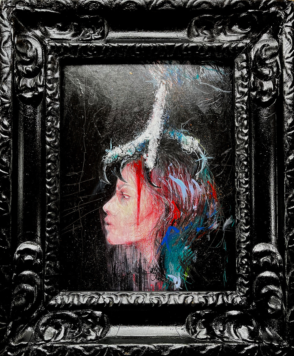 This painting inhabits that blurred space, where innocence meets unease. A girl crowned not by gold, but by bone. She is part of the tale, and also its teller."