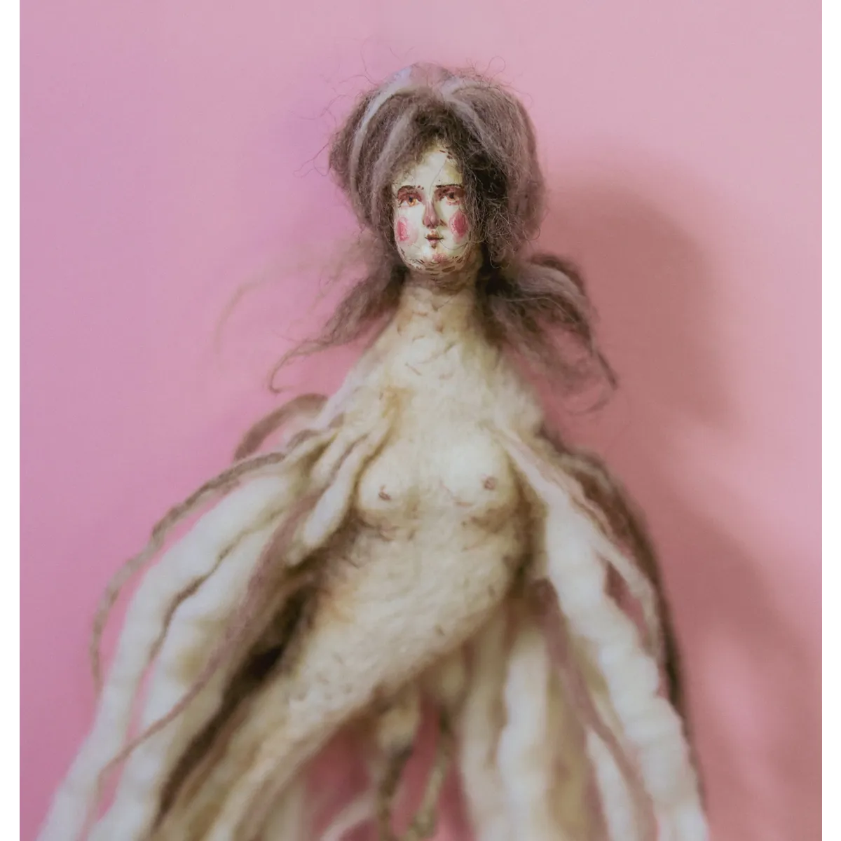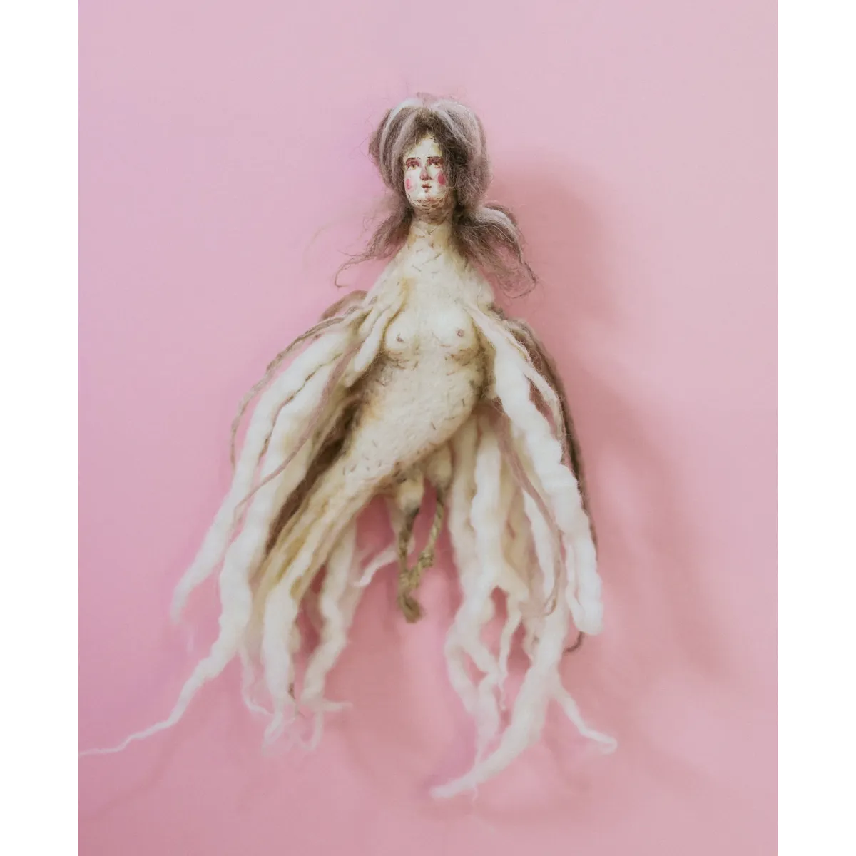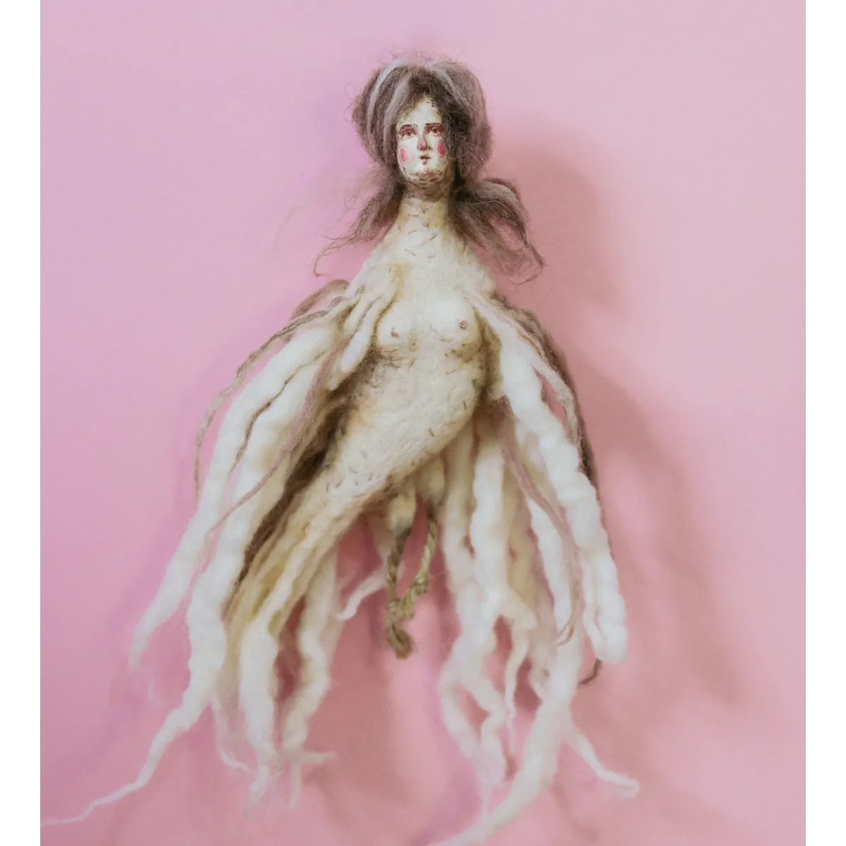 Medium: Needle-felted wool, air-dry clay face cast from a handmade mold based on an antique porcelain figurine, transparent Swarovski crystal tiara, wire hanging hook