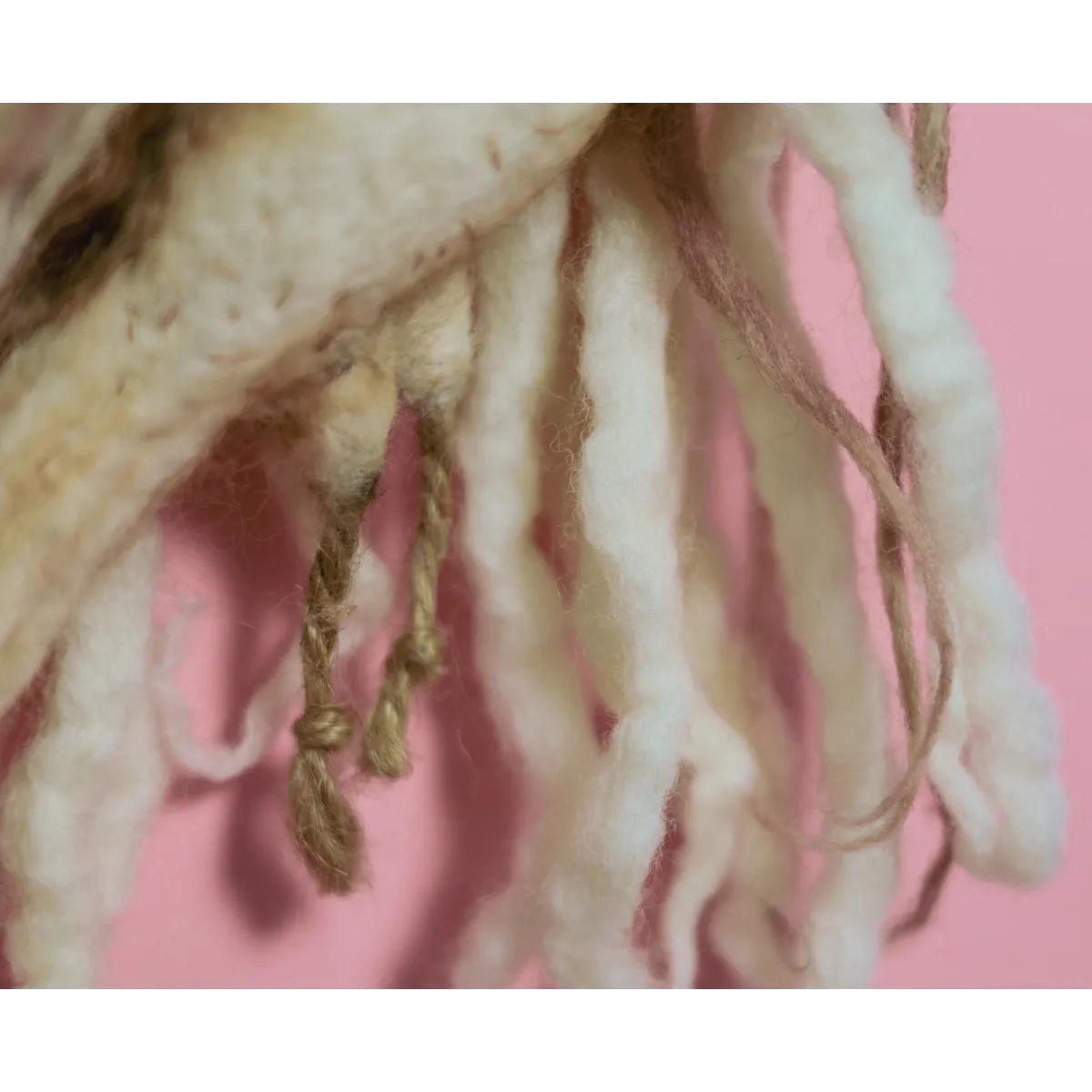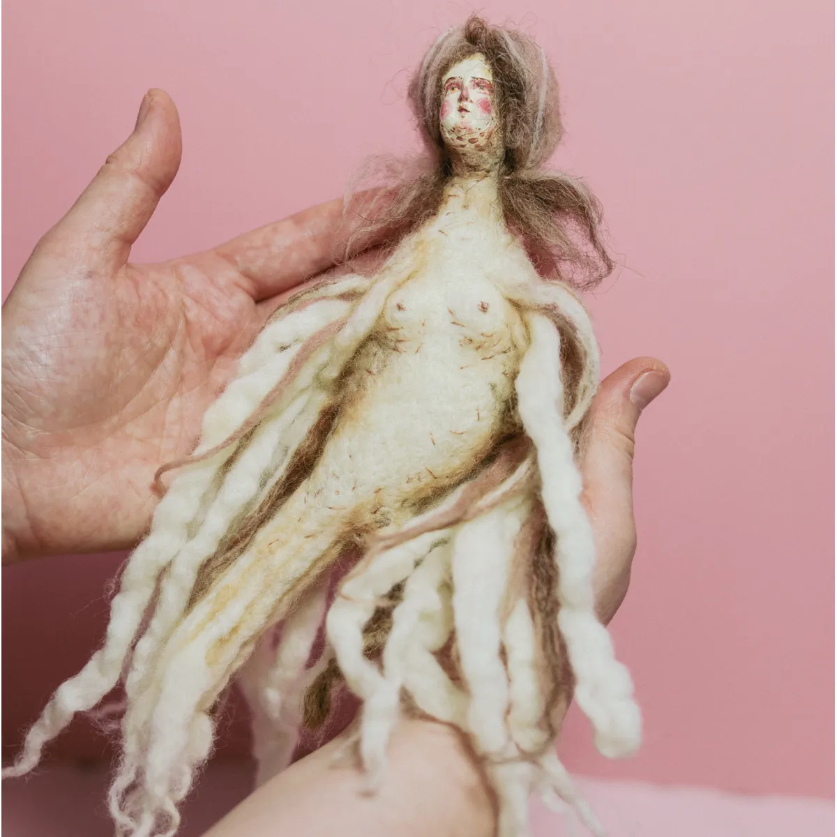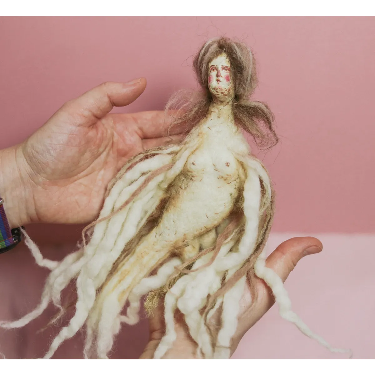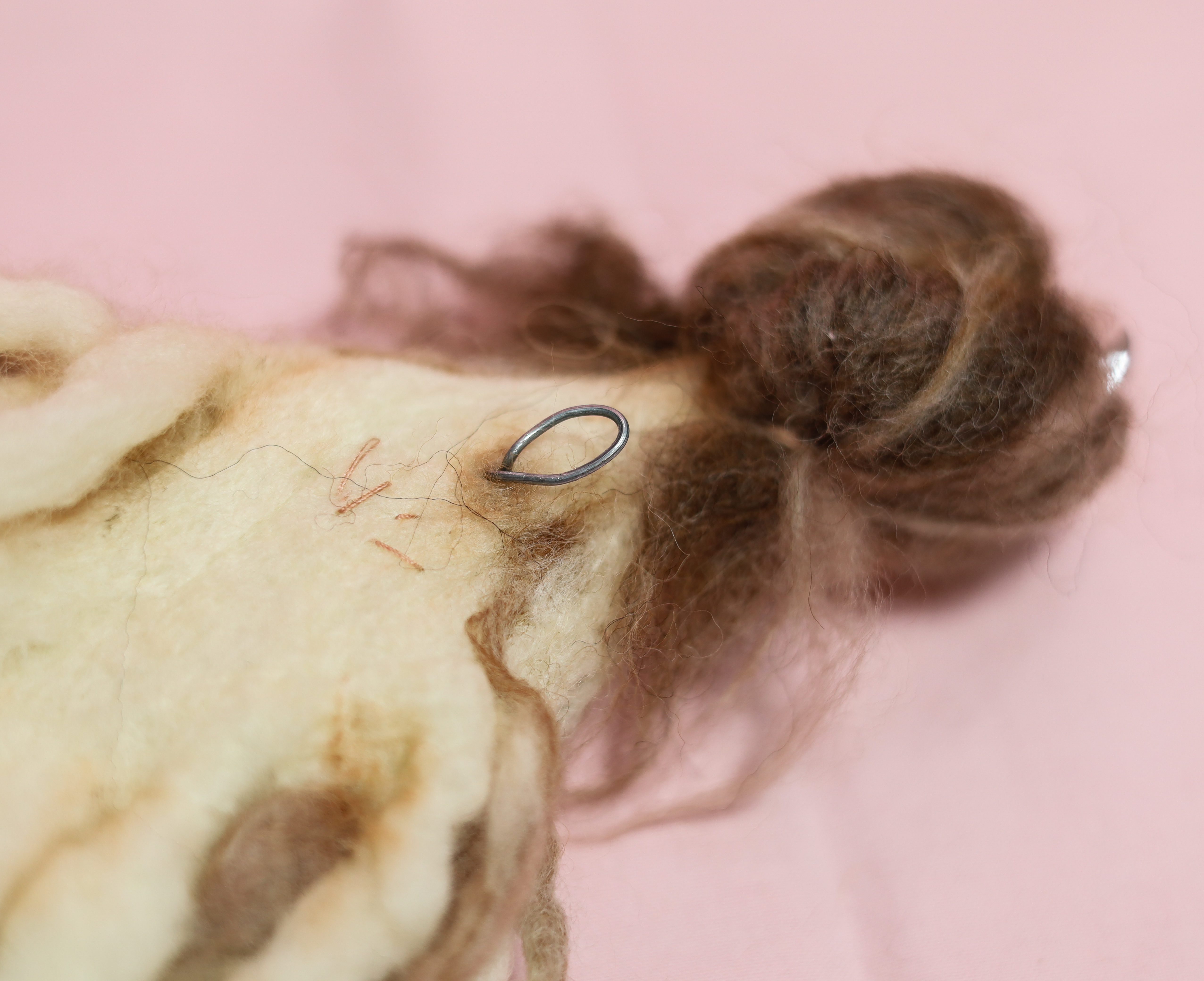 Medium: Needle-felted wool, air-dry clay face cast from a handmade mold based on an antique porcelain figurine, transparent Swarovski crystal tiara, wire hanging hook
