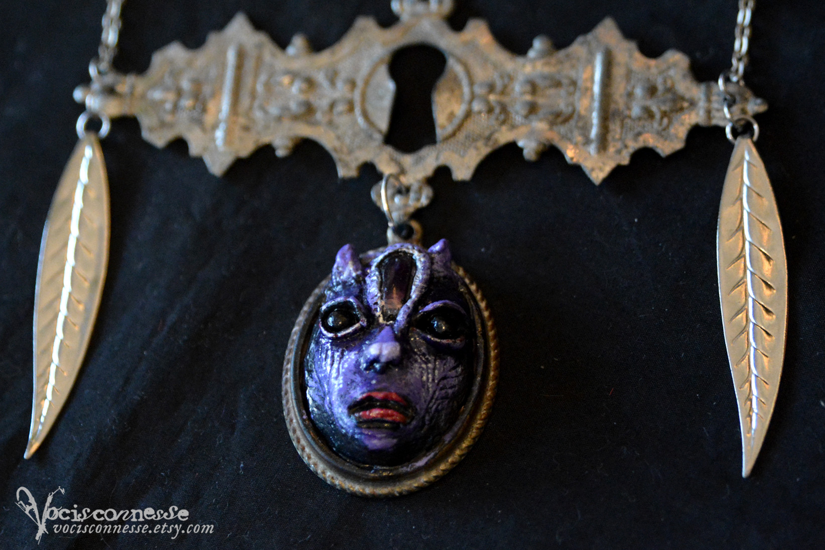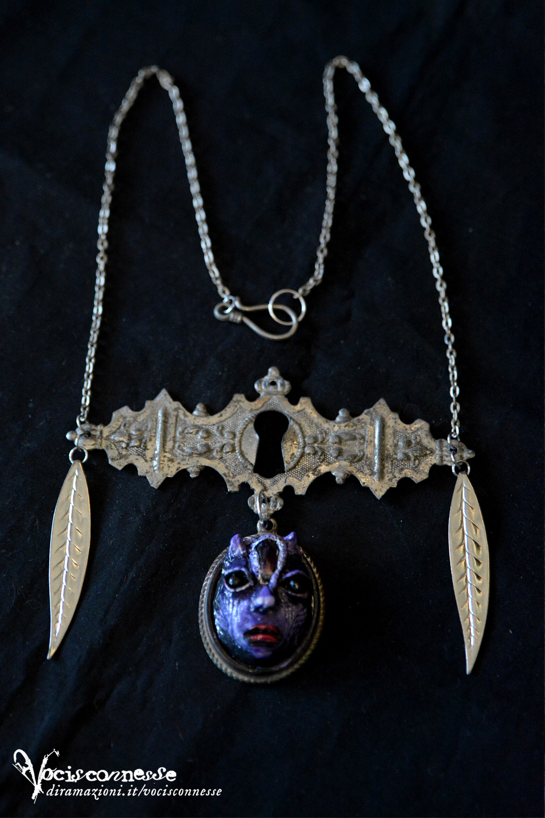Medium: Mixed media art necklace. The fairy pendant is made in natural modelling clay, acrylics. Other necklace materials are vintage metal keyhole, vintage metal leaves, silver tone metal chain.
